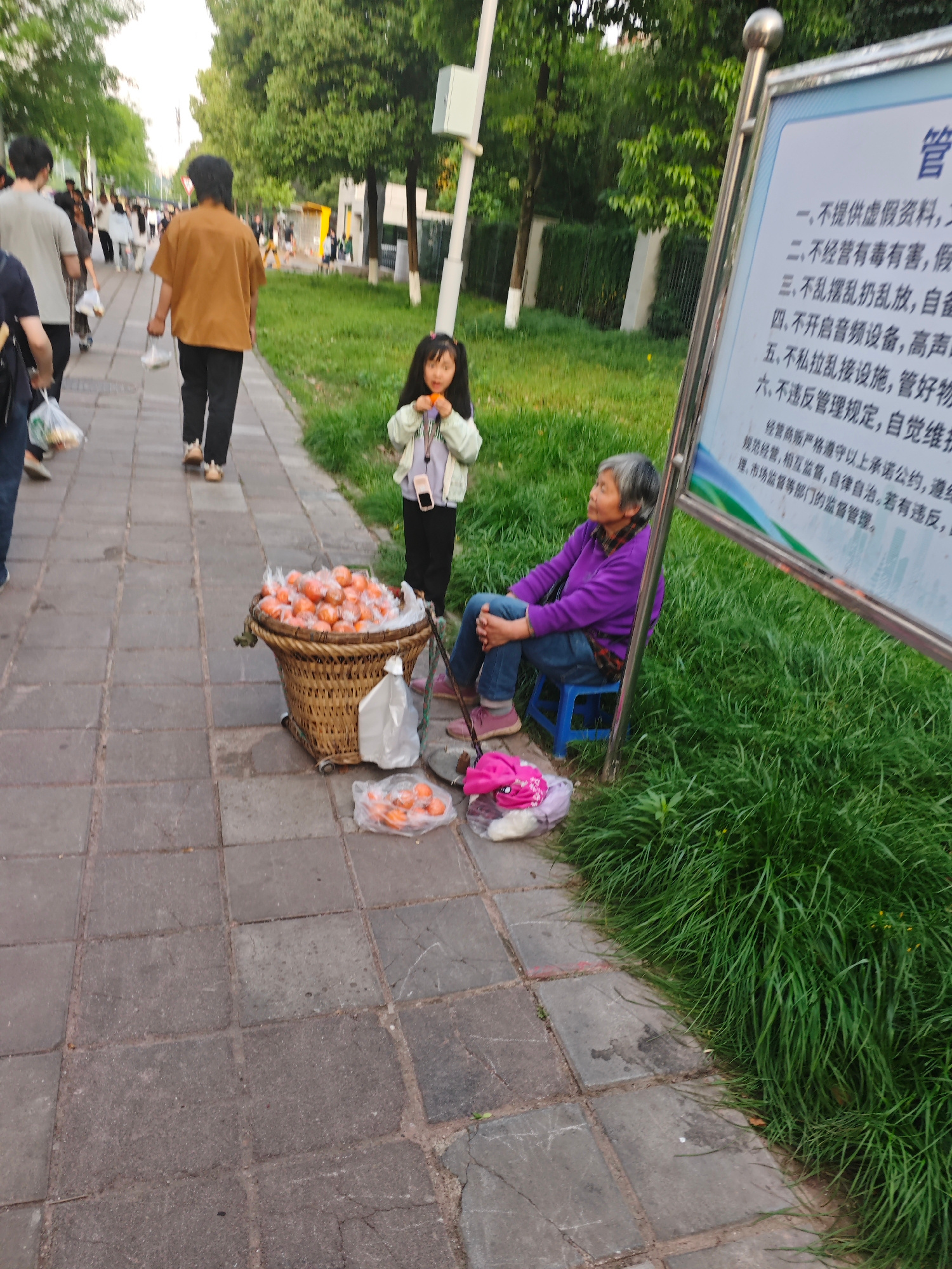 Here's a detailed description of the image: **Setting:** A paved sidewalk in Shapingba District, China, bordered by grass and greenery on one side. A sign with Chinese characters is visible. **Peopl…read more