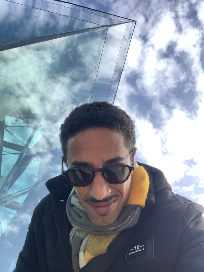 A low-angle outdoor shot frames a single individual, appearing to be a male, against a modern glass building and a partly cloudy sky. The individual, positioned centrally in the lower frame, has a medβ¦read more