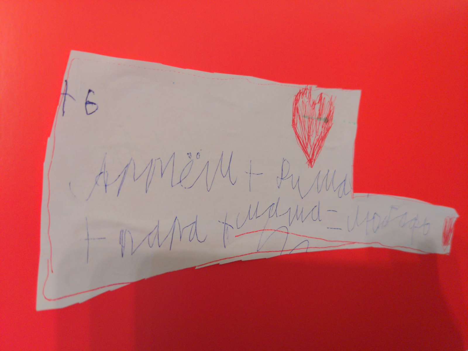 A piece of white paper with handwritten text in blue ink and a red heart drawing is placed on a red background. The text appears to be in Russian. The paper is torn along the right edge. The location…read more