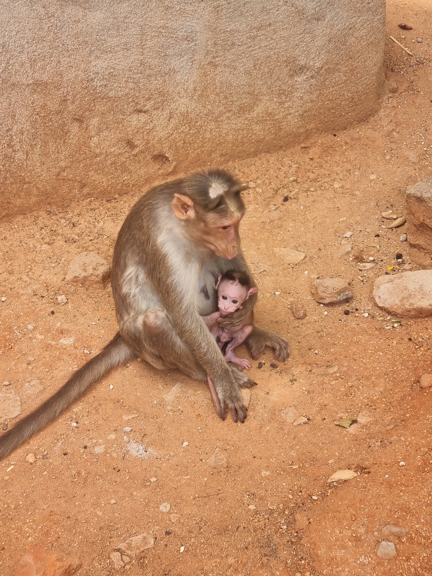 Captured in Puttaparthi, India, this high-angle shot reveals a primate interaction on a red-earth-toned surface. A light-brown adult monkey rests prone, its tail extended into the lower center. A newbβ¦read more