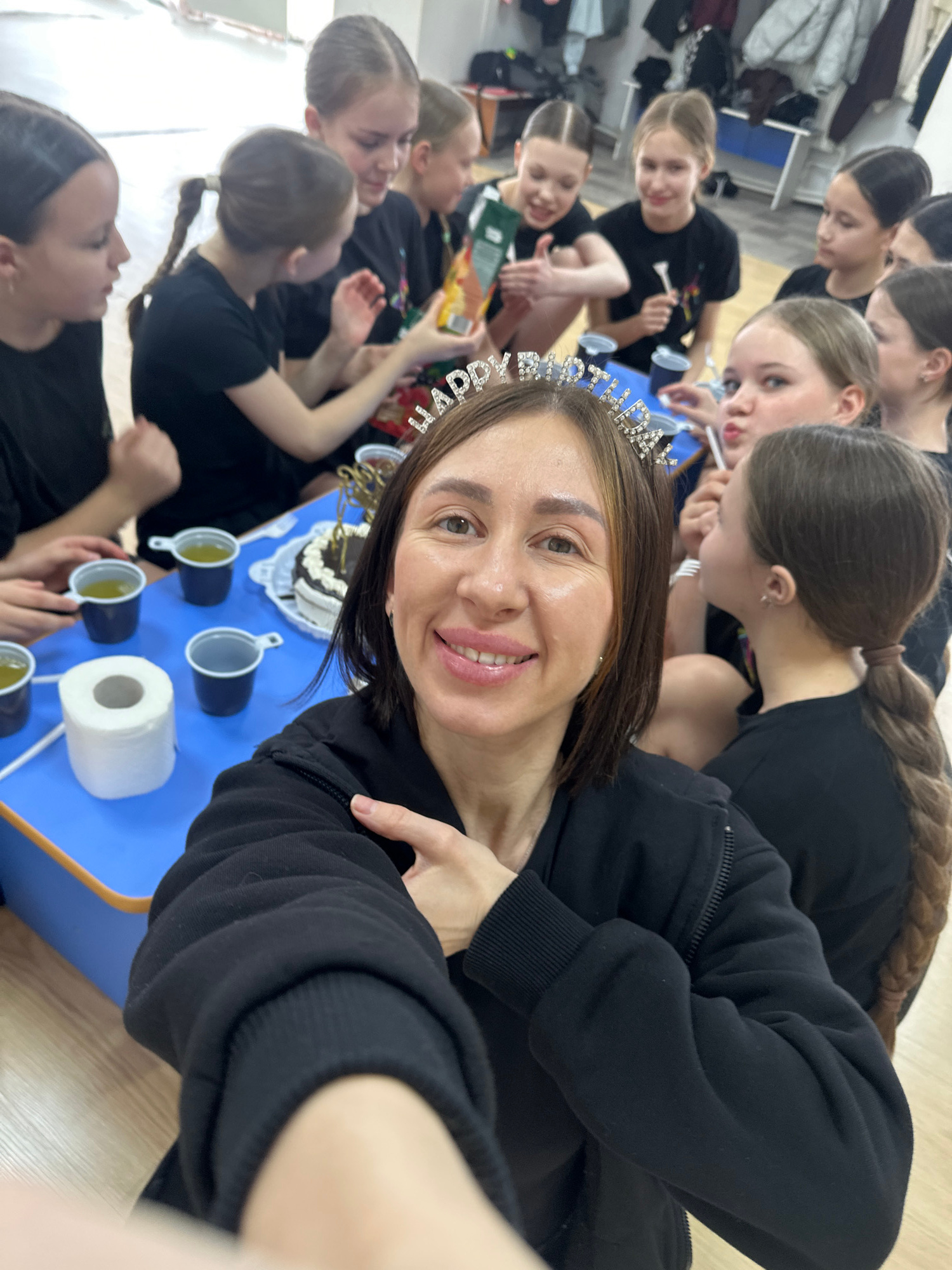 A selfie-style photograph depicts a woman with a tiara celebrating her birthday with a group of girls, likely students. The woman has shoulder-length brown hair and is wearing a black hooded jacket. She smiles directly at the camera. Behind her, a blue table is set with cups of a light-colored liquid, a roll of toilet paper, and a cake. The girls surrounding the table have their hair pulled back, and are wearing black tops, suggesting a dance or performance context. They are engaged in the celebration, likely eating cake and interacting with each other. The scene appears to be indoors, possibly in a dance studio or dressing room. The location might be inferred as Votkinsk, Russia, based on an external prompt. The overall ambiance suggests a birthday celebration following a performance or rehearsal. | Open Wire