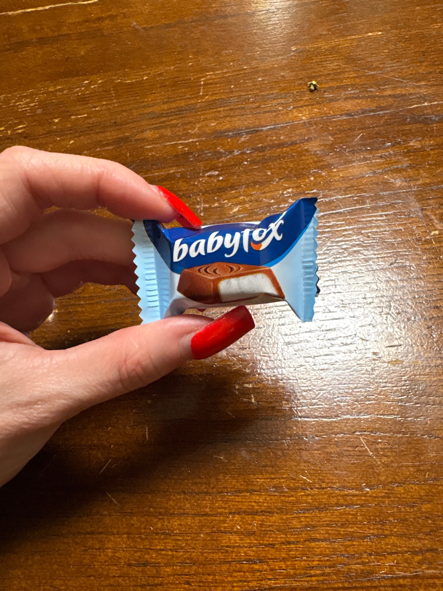 A hand with red polished fingernails holds a candy bar labeled "babyfox" in the center of the frame. The background consists of a wooden surface with a light-colored, slightly reflective finish and gr…read more