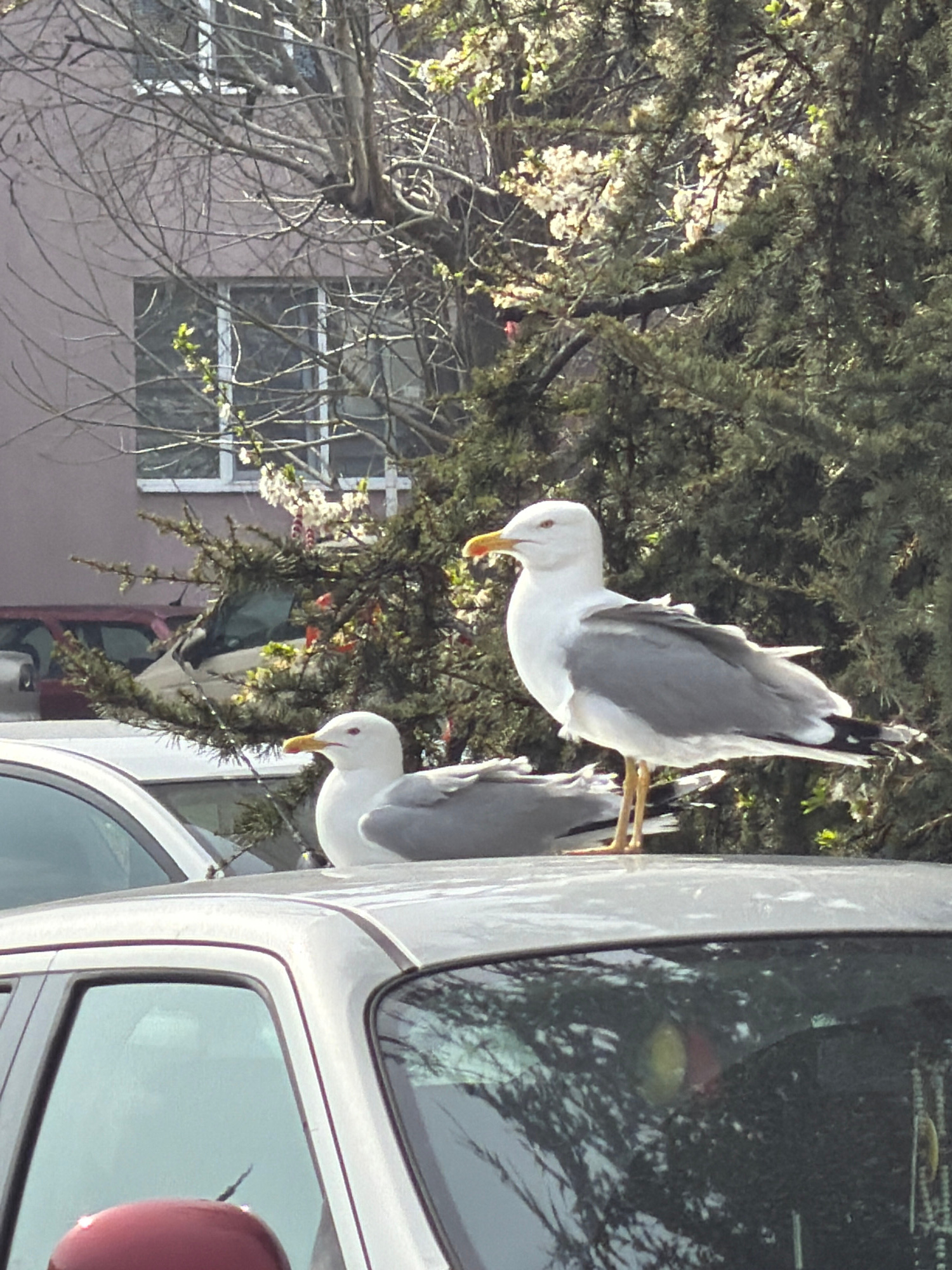 Two seagulls perch on a white vehicle, near foliage and a building with windows. The location is likely Burgas, Bulgaria.