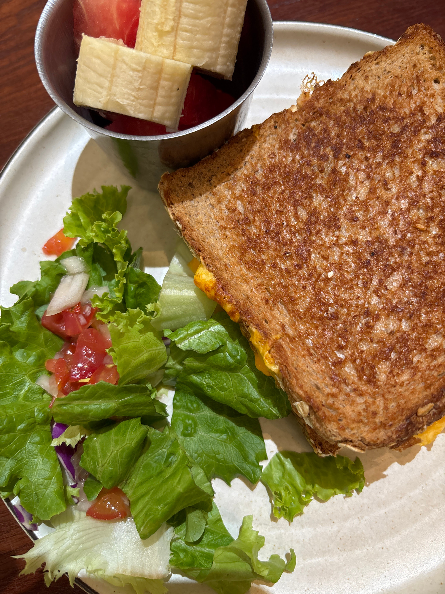 A grilled cheese sandwich is positioned on a plate next to a green salad with visible tomato and onion pieces, accompanied by a metal container of sliced banana and watermelon. The plate is on a woode…read more