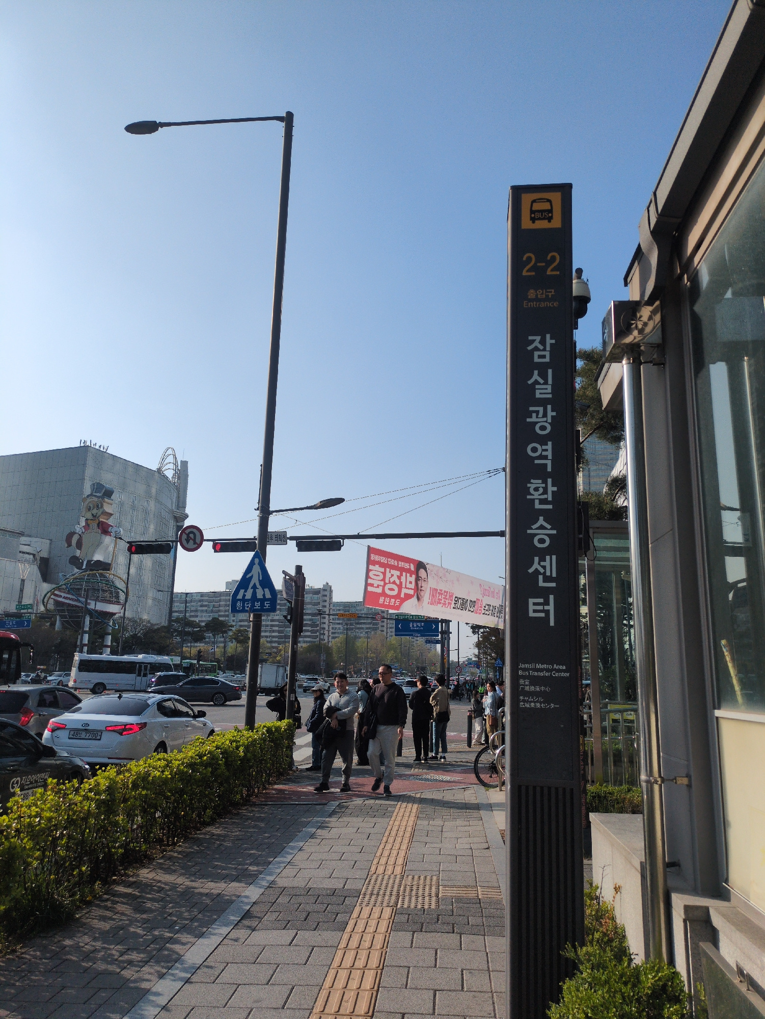 Here's a description of the image: The image depicts a street scene in Seoul, South Korea, at the Jamsil Metro Area Bus Transfer Center. The most prominent feature is a sign indicating "Jamsil Metro…read more