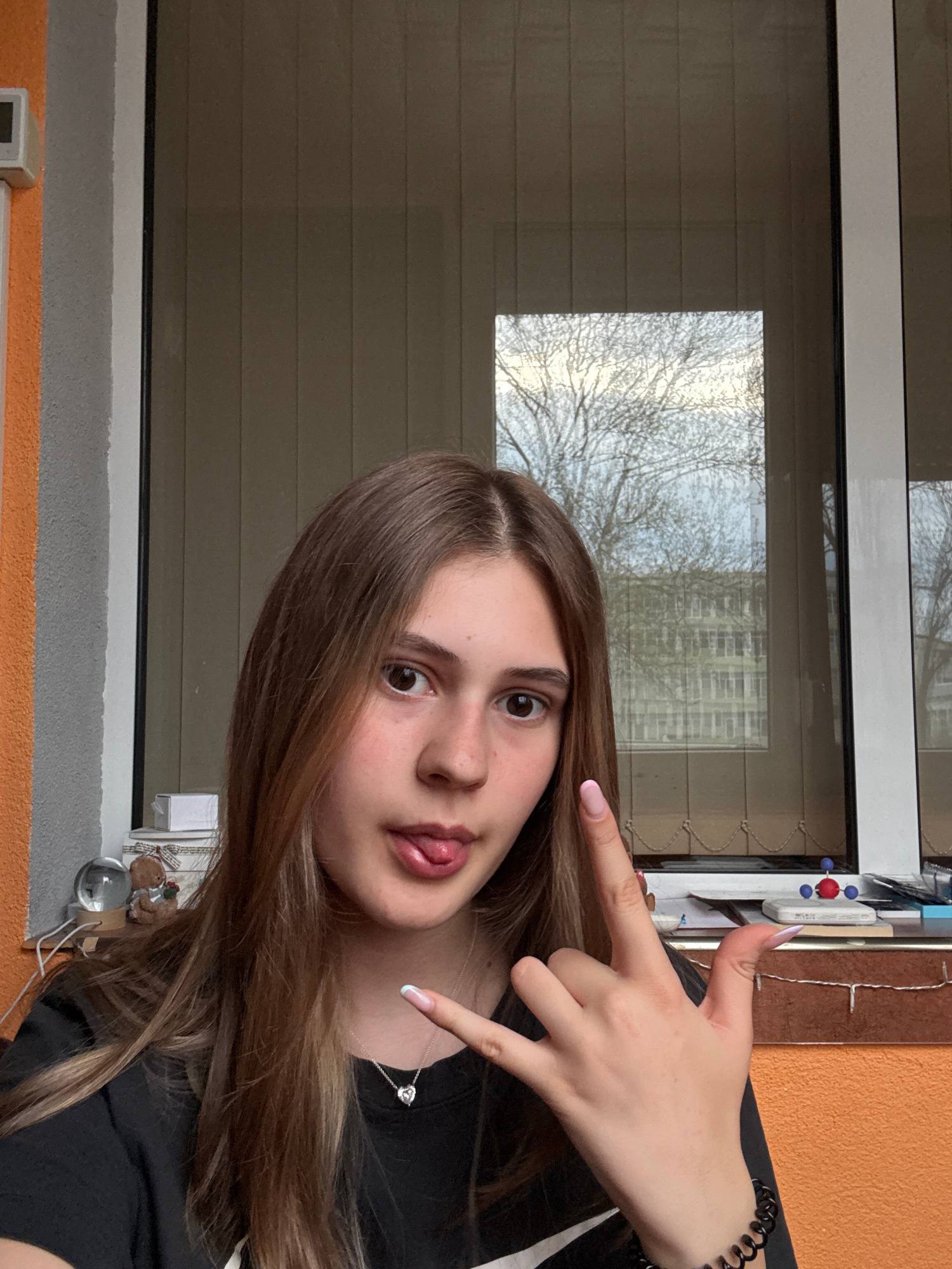 The image, originally rotated 90 degrees clockwise, presents a close-up of a young woman posing indoors by a window. She has long, straight brown hair, brown eyes, and a light complexion. She looks di…read more