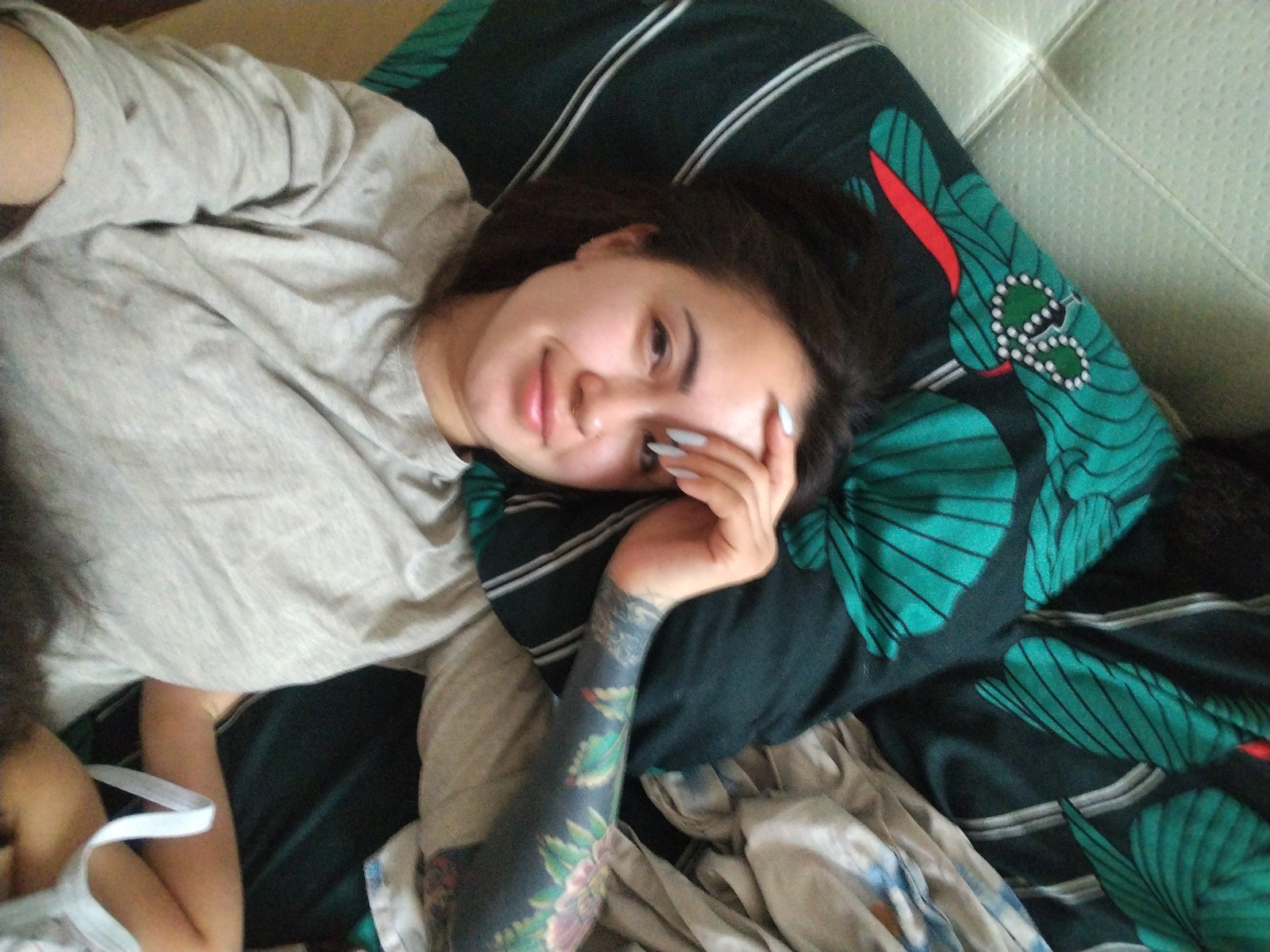 A woman lies on a bed in an interior setting. She has dark hair, fair skin, and visible tattoos on her left arm. She is wearing a gray top. Her right hand is resting near her face. She is lying on a pβ¦read more