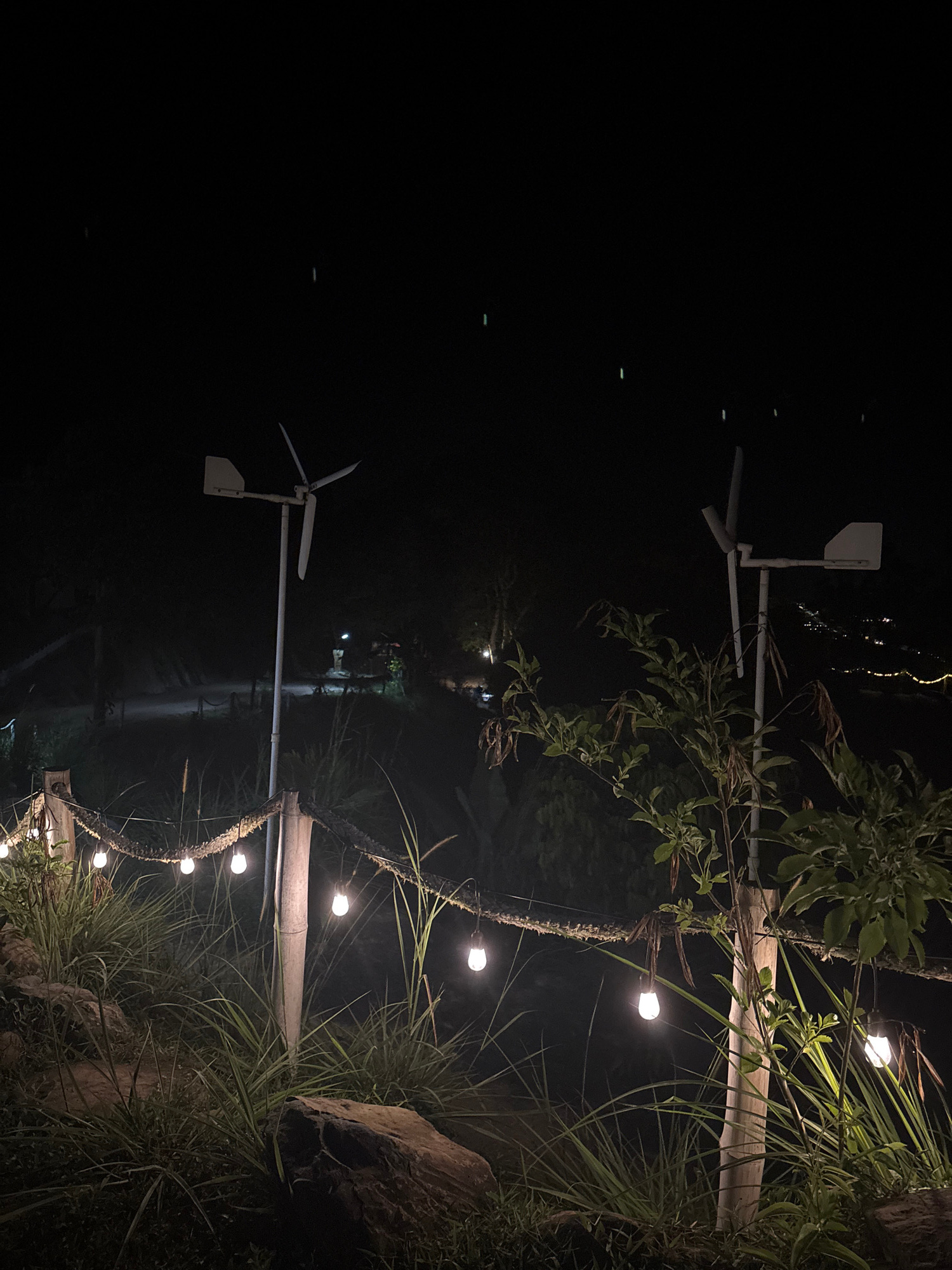 At night in Khlong Khian, Thailand, the scene features vegetation along a water's edge, illuminated by string lights. Two small, white wind turbines are visible along the shoreline. The background is…read more