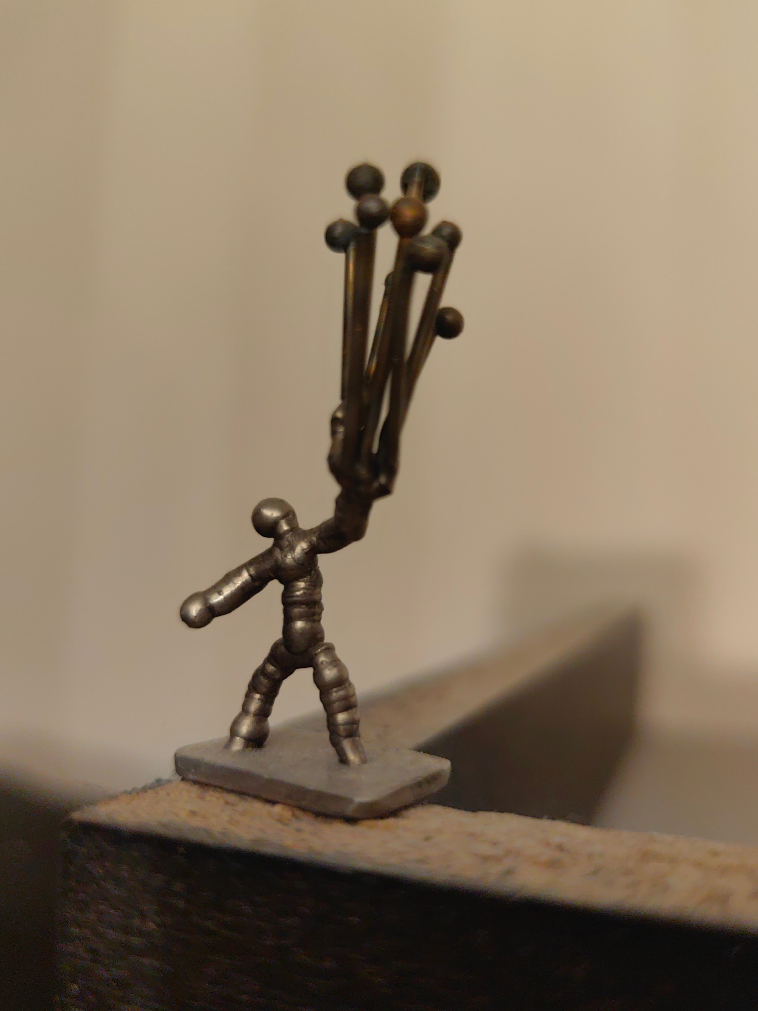 The image displays a close-up of a small, metallic figurine captured indoors in Sofia, Bulgaria. The central subject is a stylized human-like figure, rendered in a dull silver-grey metal. Its form is…read more