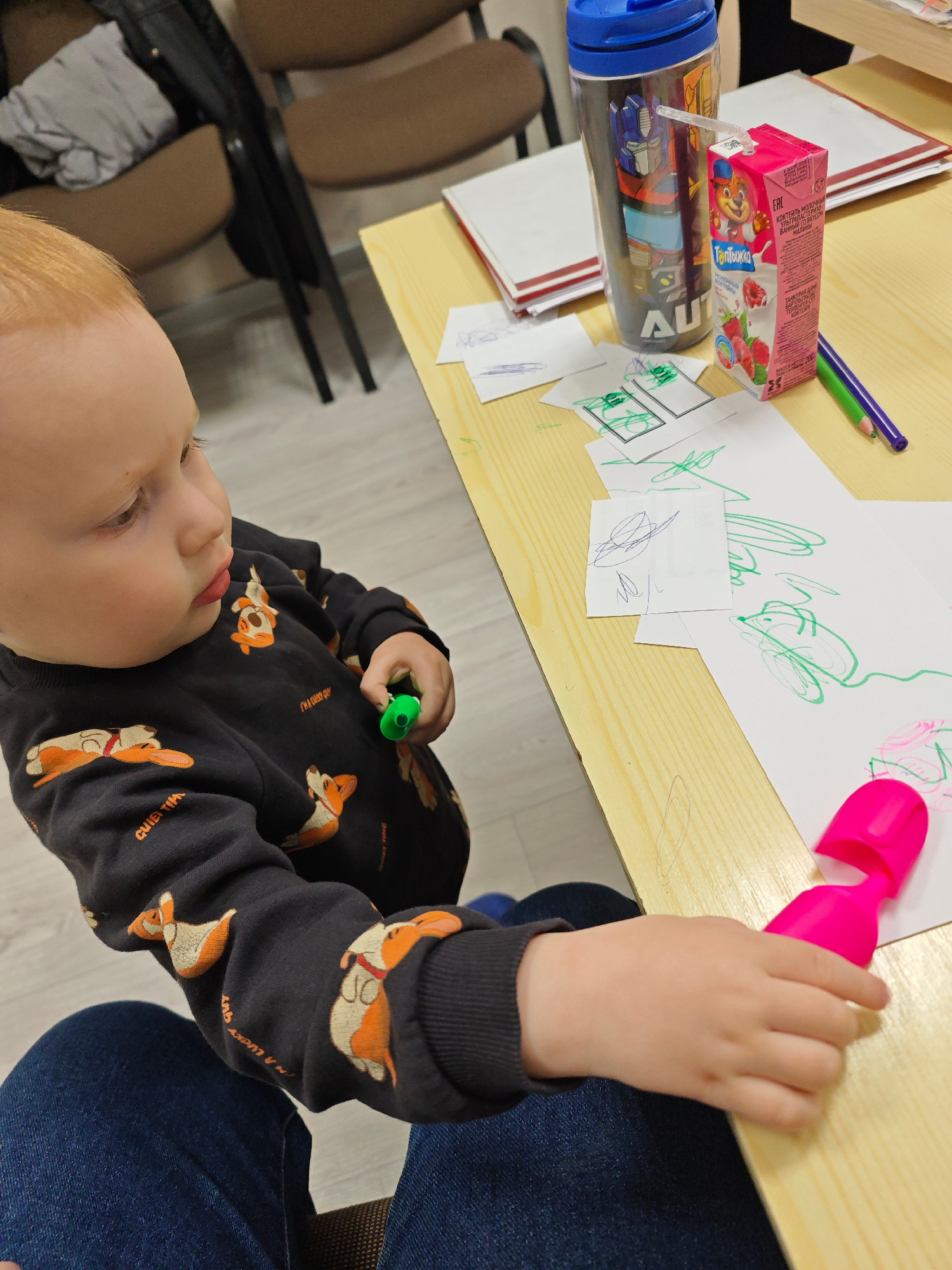 In an indoor setting in Markovskii, Russia, a young child with reddish-blonde hair is engaged in drawing. The child is seated on an adult's lap, seen wearing dark jeans, and is focused on the paper in…read more