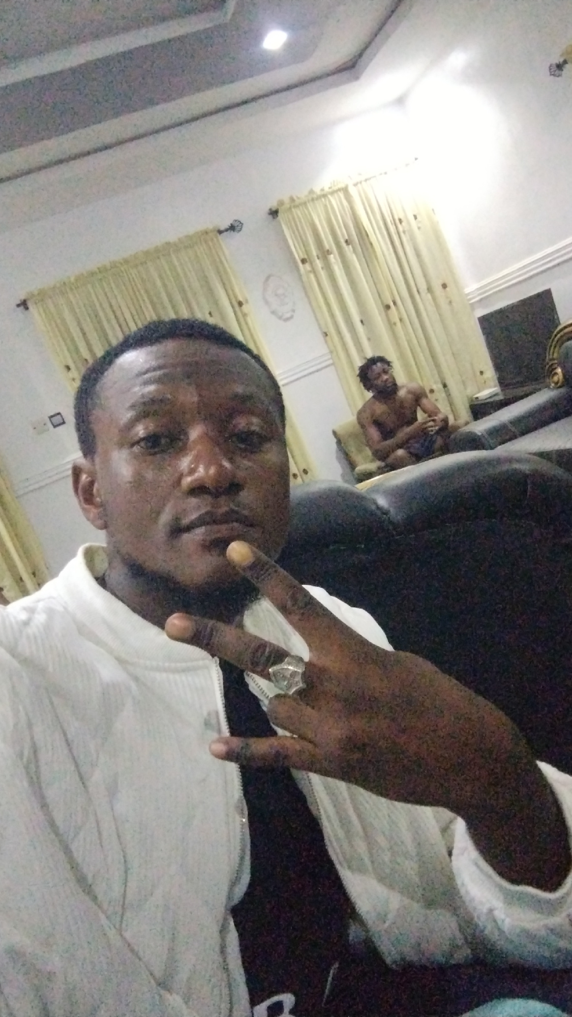A man wearing a white jacket over a black shirt displays a two-finger gesture with a large ring on his finger. In the background, a second man sits shirtless on a chair. The location appears to be ind…read more