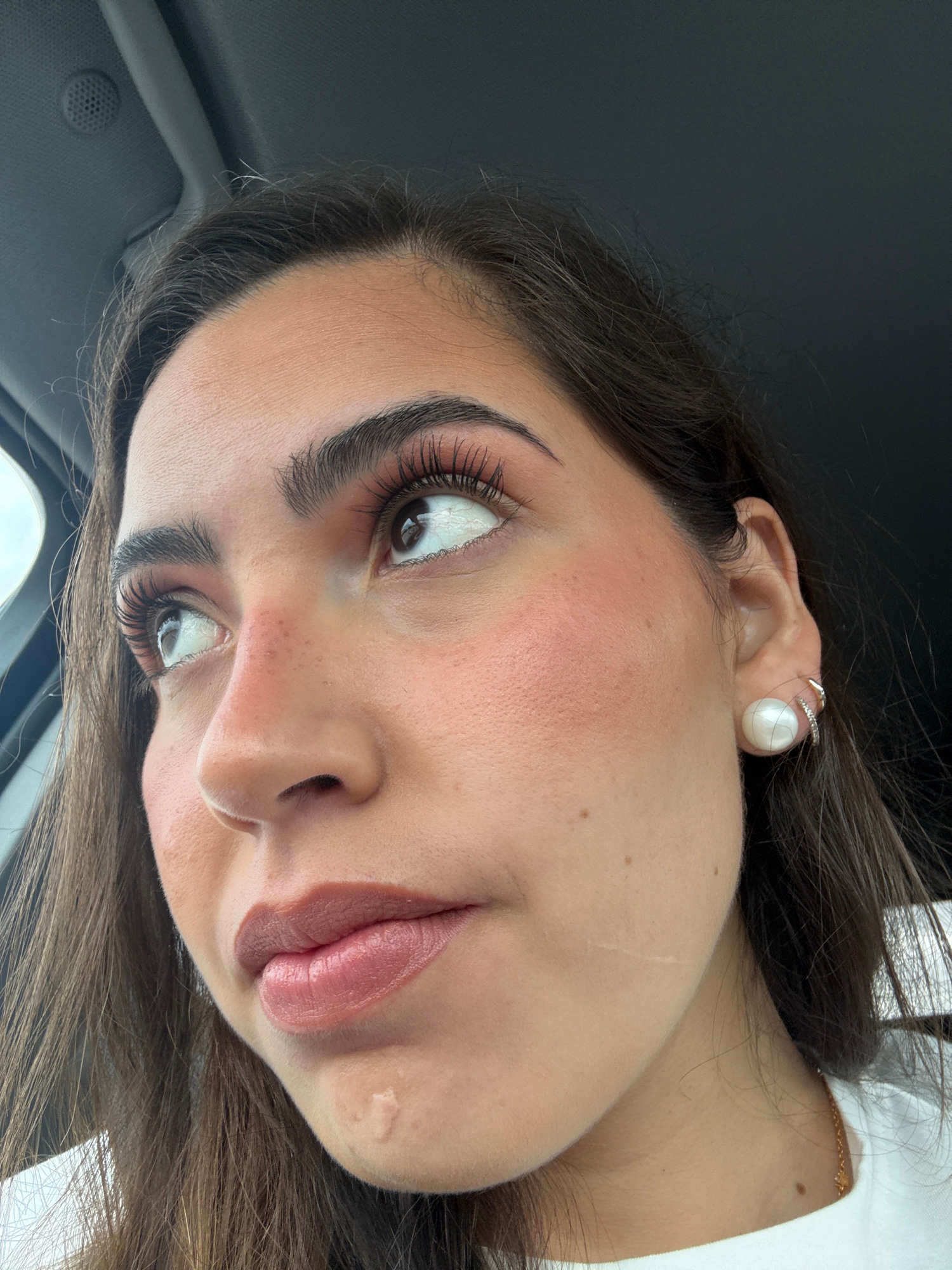A close-up, slightly rotated image shows a person's face. The individual has brown hair and light skin. They are wearing makeup, including blush, lipstick, and well-defined eyebrows with prominent eye…read more