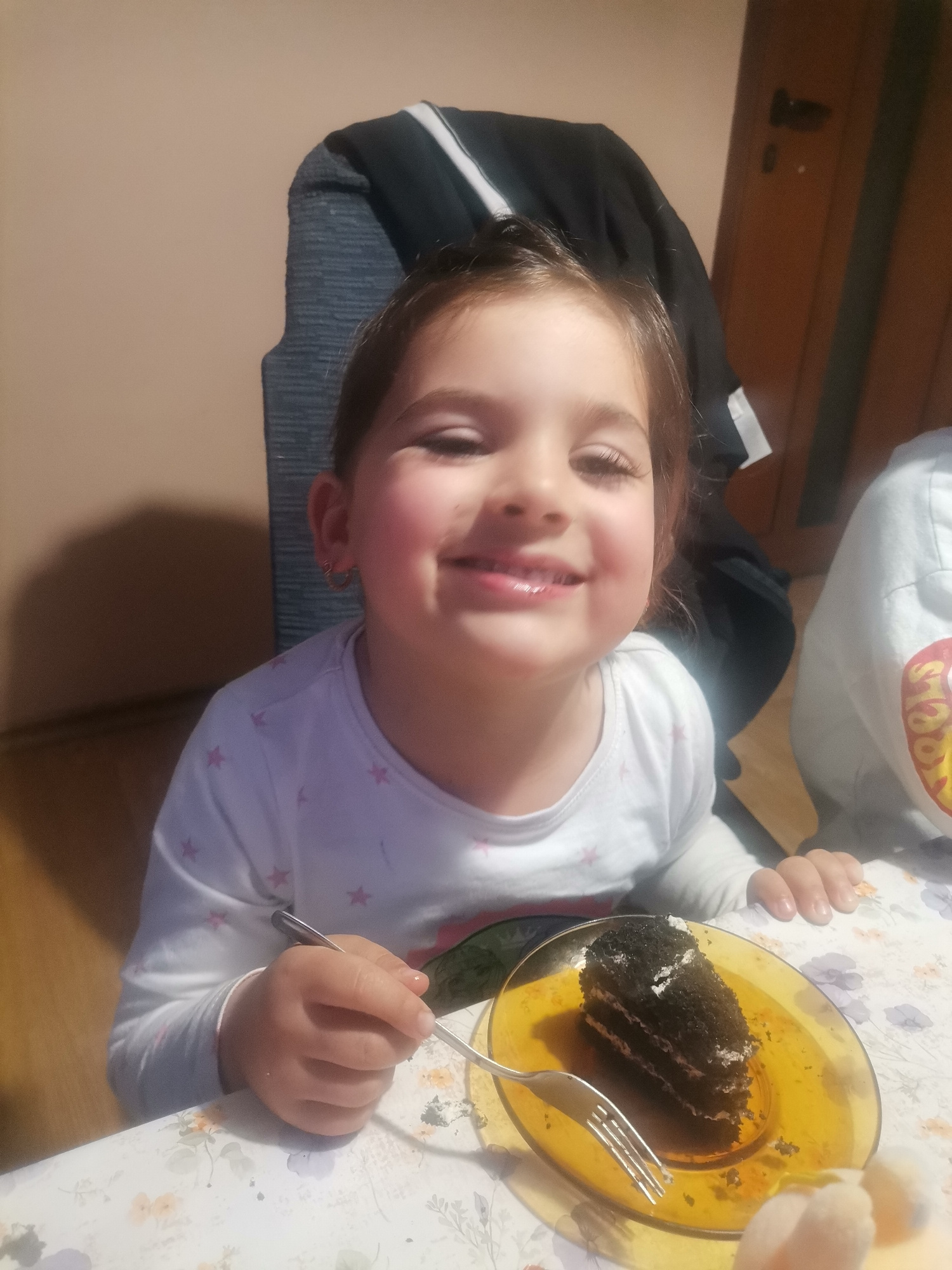 A young girl is seated at a table, smiling brightly at the camera while holding a fork. She appears to be enjoying a piece of chocolate cake placed on a yellow, translucent plate in front of her. The…read more
