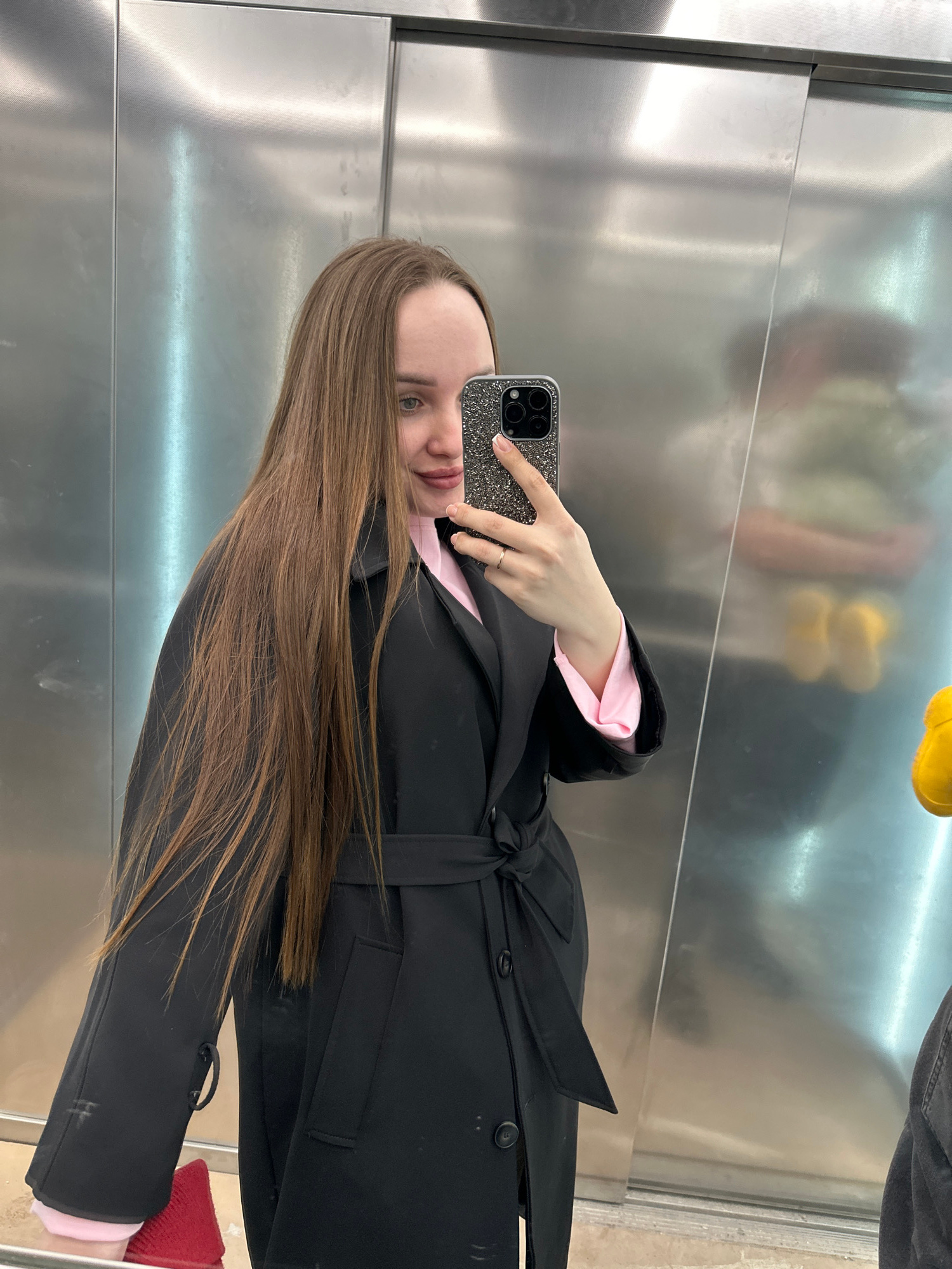 The image depicts an adult female taking a selfie in what appears to be an elevator or an indoor space with reflective metallic walls, in Pervomaysky, Russia. The precise location within the city cann…read more
