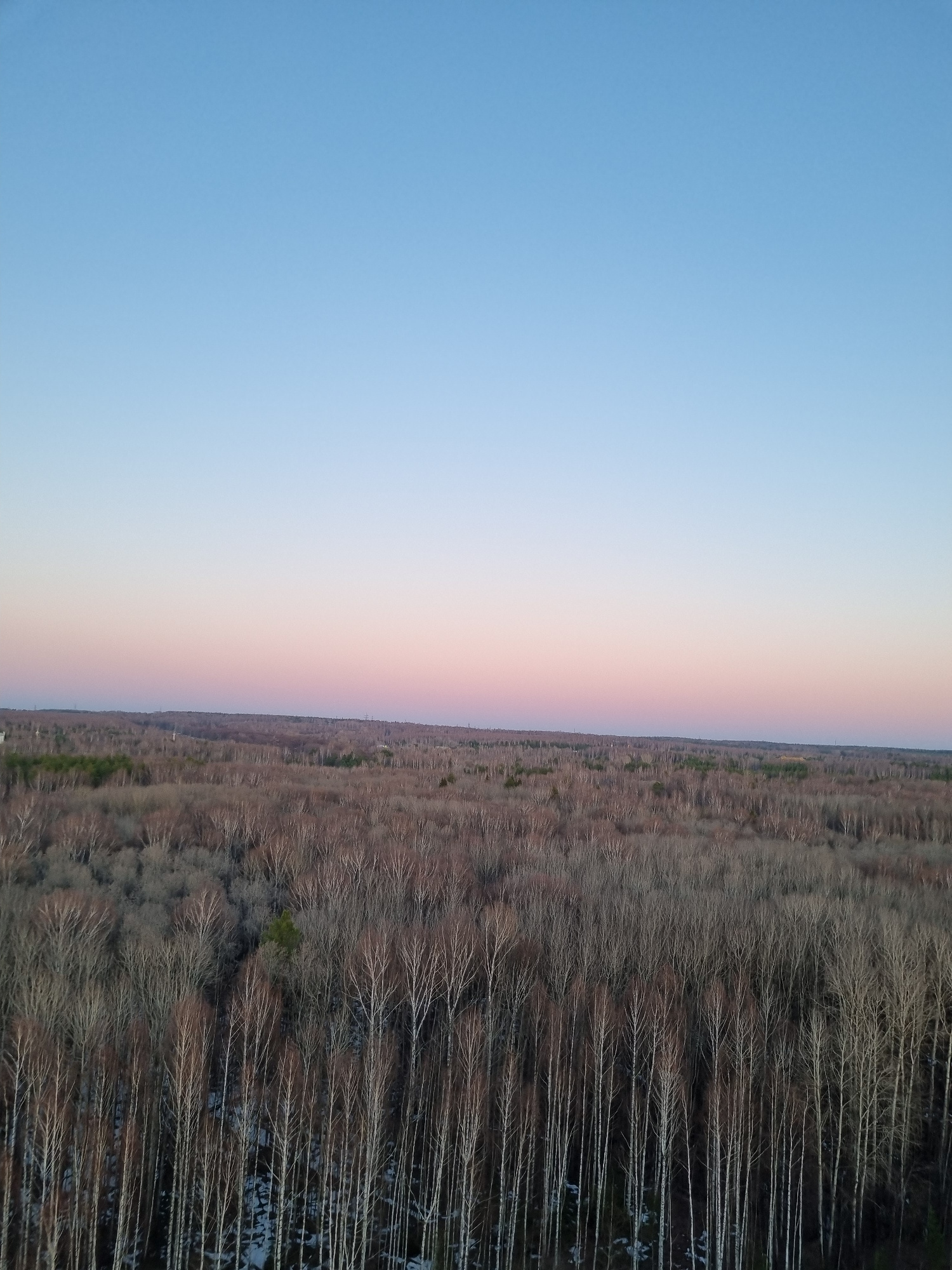 The image presents an aerial view of a rural landscape at sunset. The sky transitions from blue on the left to a pinkish-white as the sun sets. On the right, a dense forest or marshland is visible. Thβ¦read more