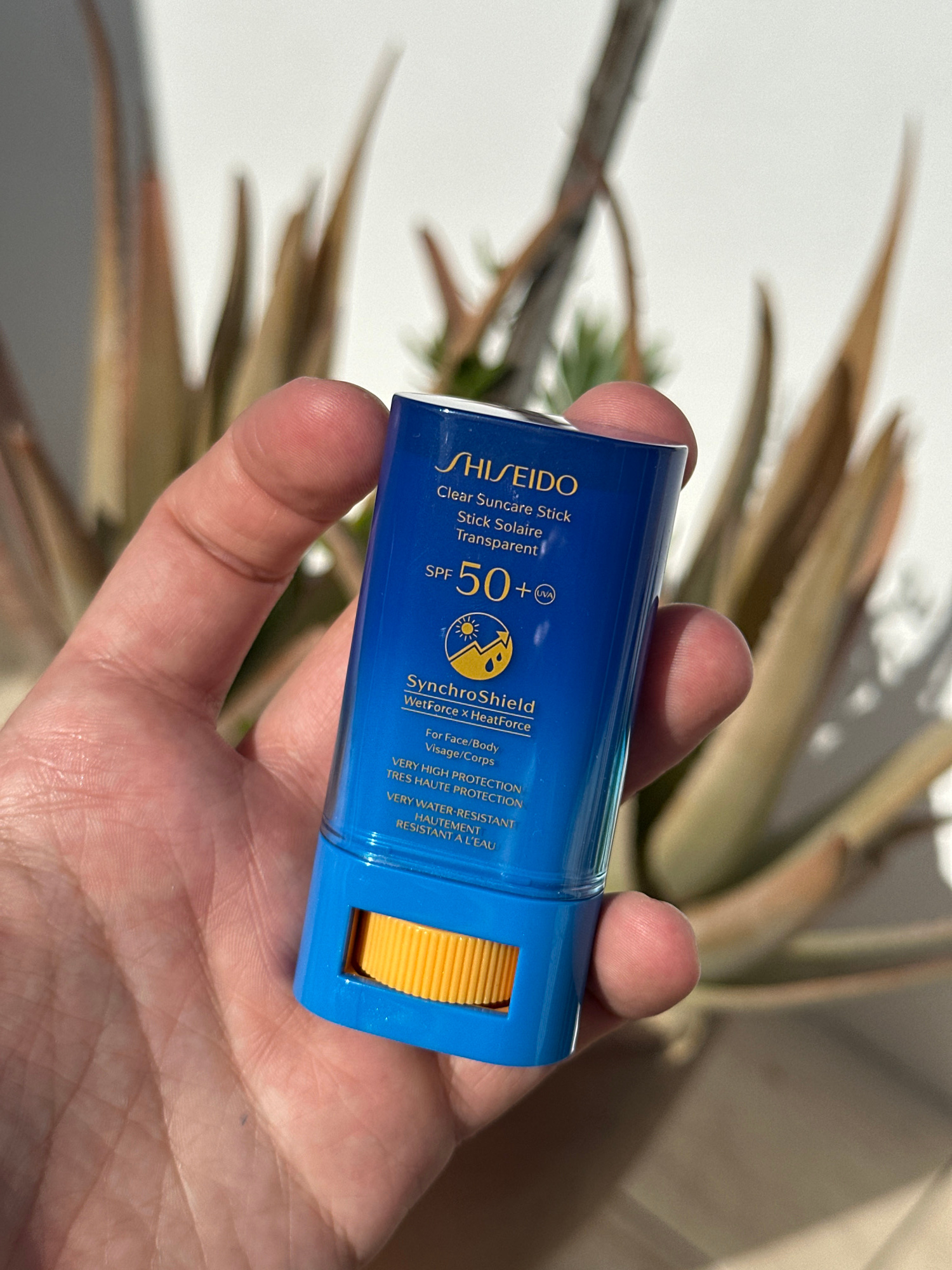 A close-up shot depicts a hand holding a blue tube of Shiseido Clear Suncare Stick sunscreen with SPF 50+. The hand belongs to a light-skinned individual, with visible lines and textures on the palm.…read more