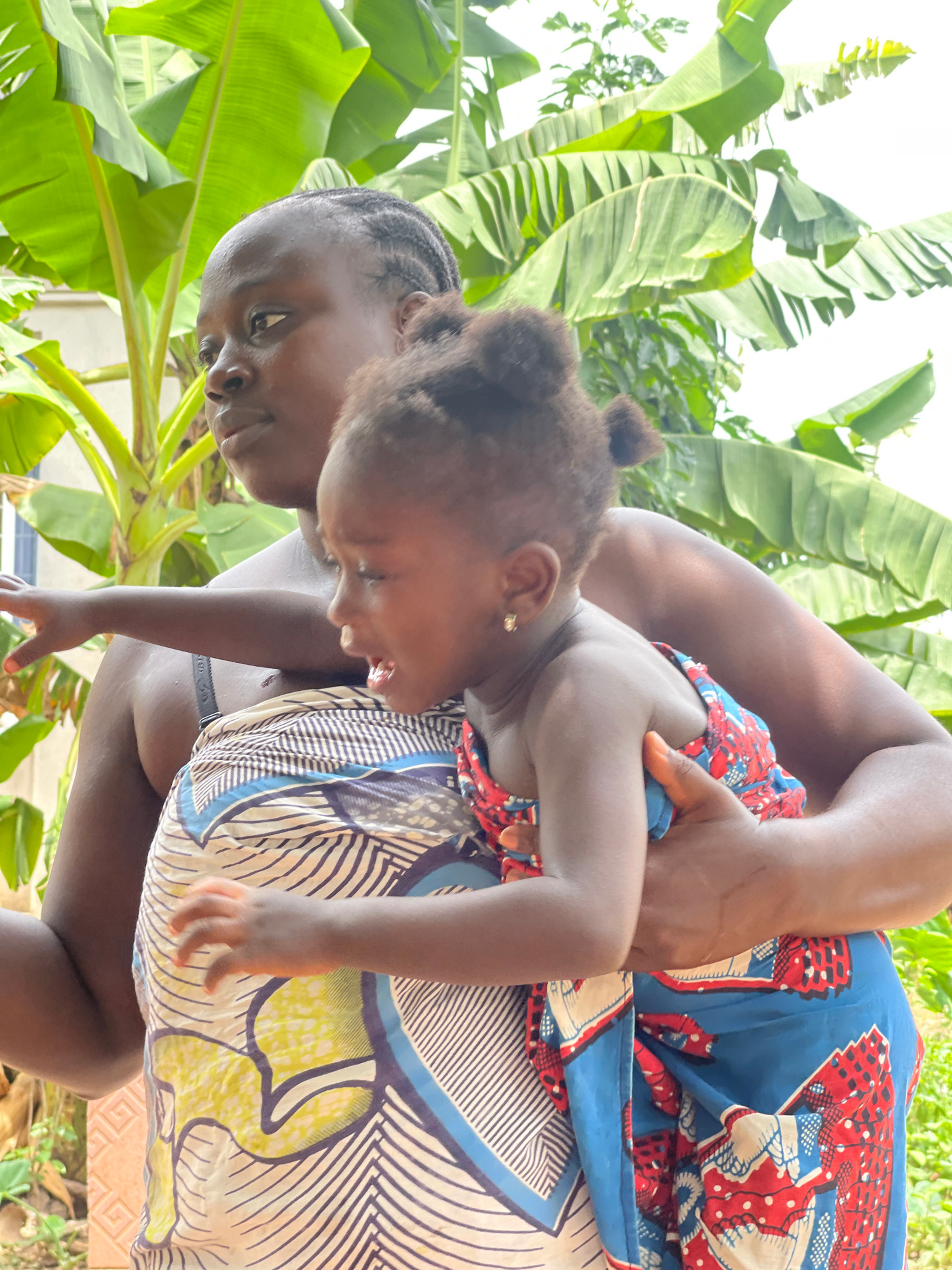 The image shows a woman in Akwanga, Nigeria, carrying a child on her back. The woman has dark skin, braided hair, and is wearing a patterned dress. The child, also dark-skinned, is held securely again…read more