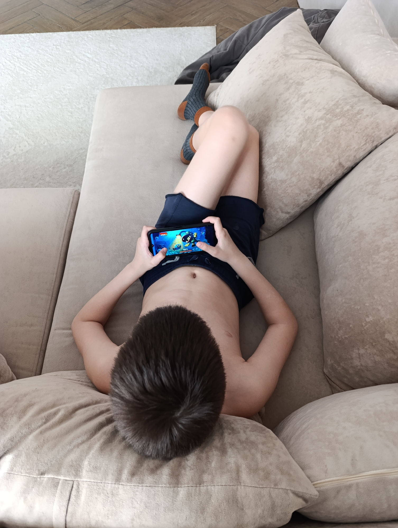 An overhead shot captures a child lying prone on a light beige sectional sofa in an indoor setting, likely a living room in Chaikovsky, Russia. The child, viewed from behind with dark, short hair, is…read more