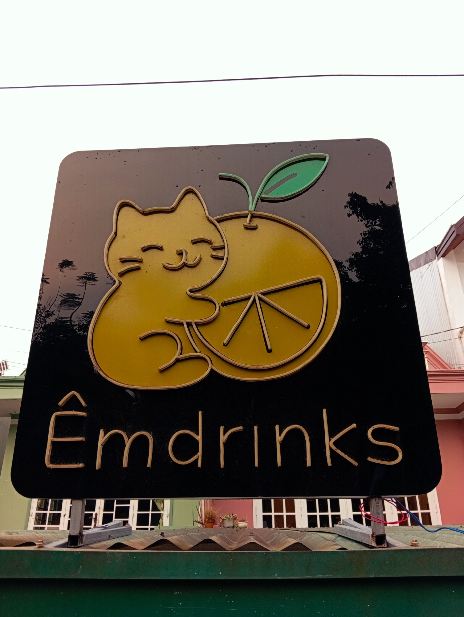 The image displays a rectangular black sign with a prominent yellow graphic and text. The graphic features a stylized, happy yellow cat with closed, smiling eyes, appearing to embrace or lean against…read more