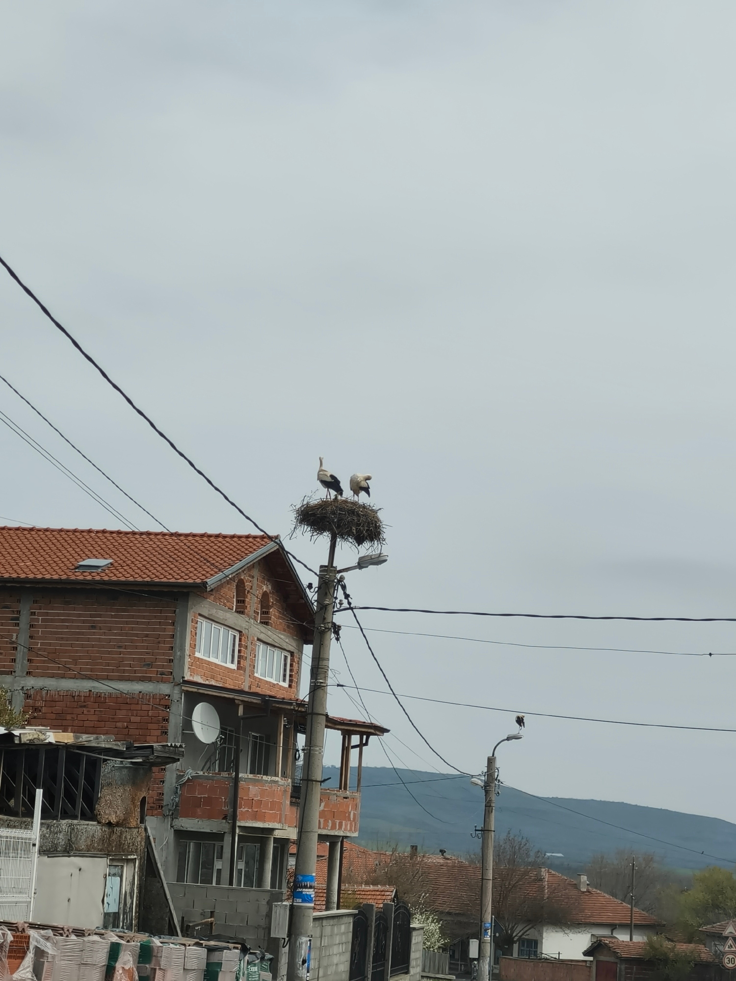 The image depicts a village scene in Unknown, Unknown. A two-story red brick building with a red tiled roof is visible. In front of the building are materials stacked and covered. A power pole stands…read more