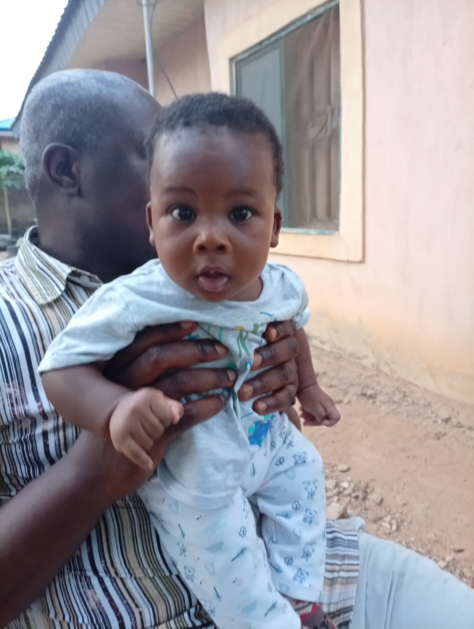 An older, bald African man is holding a baby in his arms. The baby is wearing light-colored pajamas with a pattern and has dark skin. The man is wearing a striped shirt. They are outside in front of a…read more