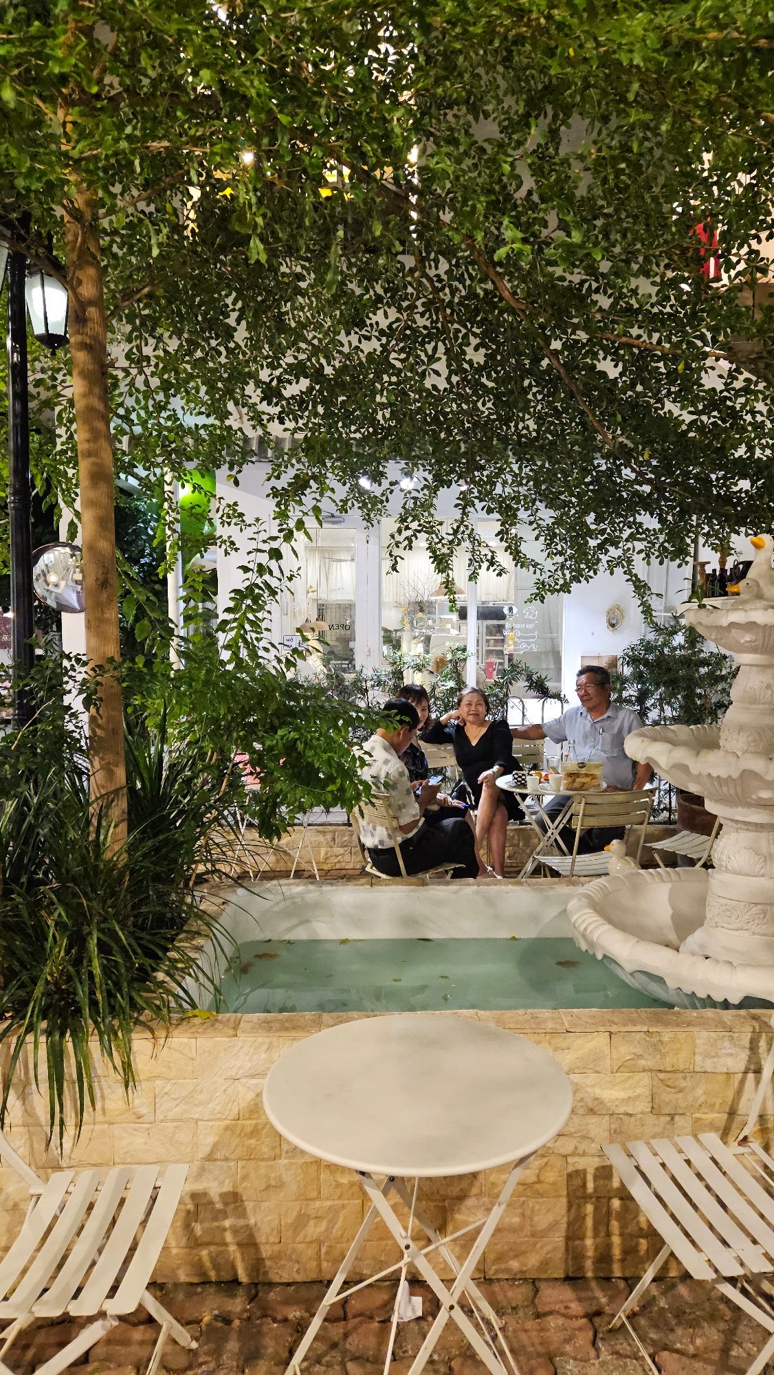 The image shows an outdoor cafe scene in Nha Trang, Vietnam. Several people are seated at tables, engaged in conversation. A white, round table and matching chairs sit on a paved surface, possibly bri…read more