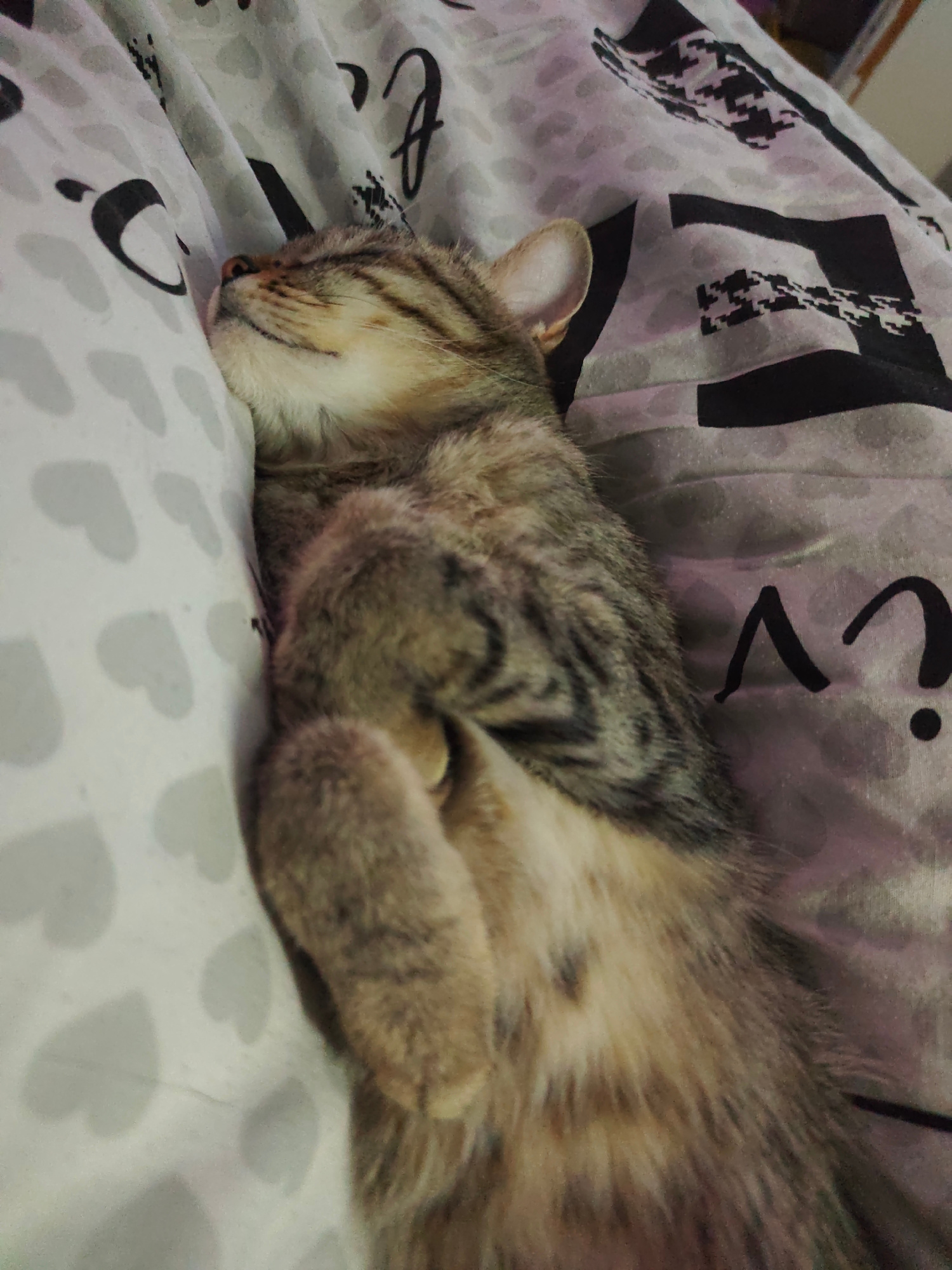 A tabby cat sleeps on a patterned bed. The cat is curled up on its side with its paws tucked in. The bedsheets have a white background with grey hearts and black question mark designs. The location is…read more