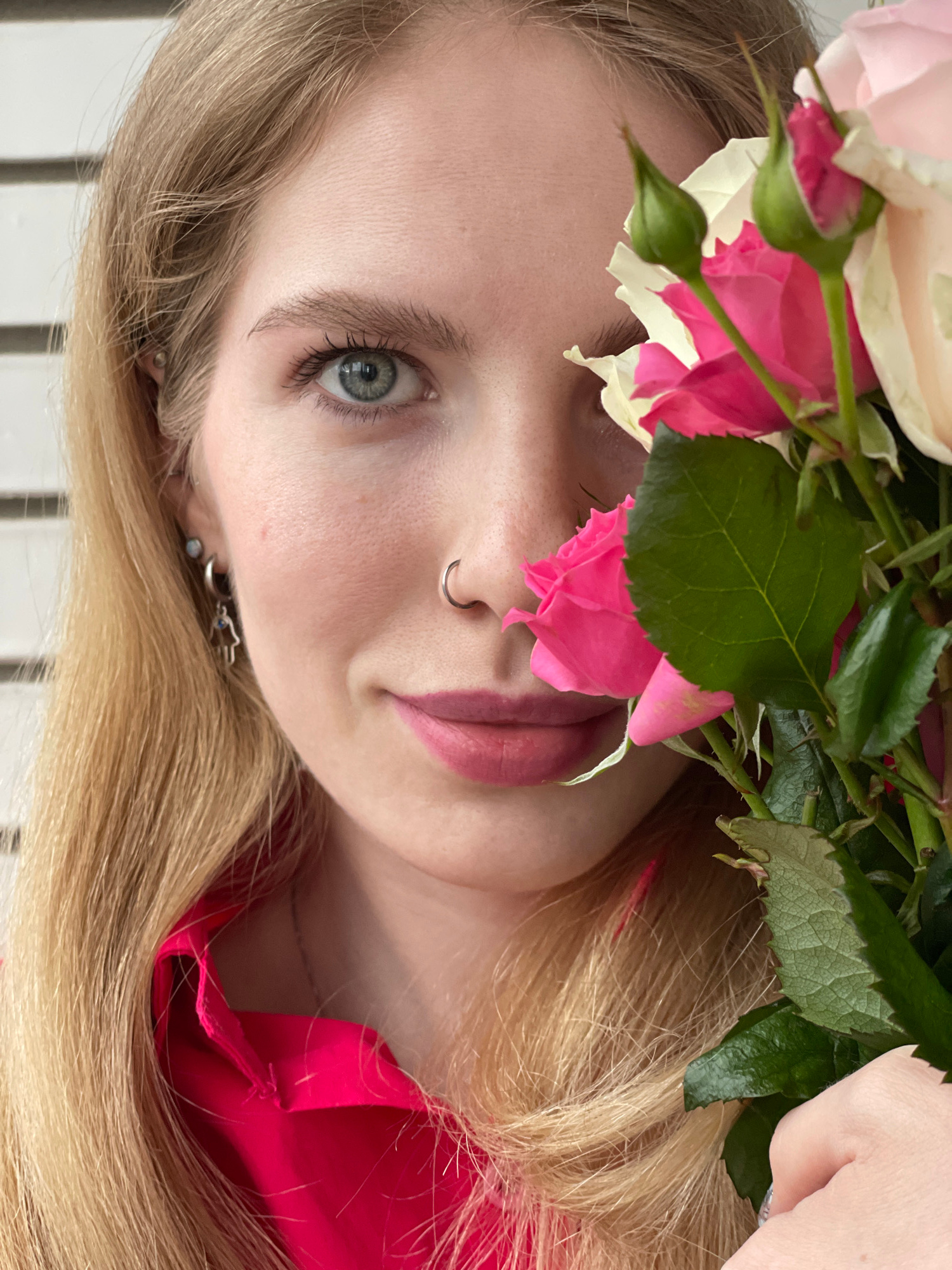A close-up, angled portrait features a fair-skinned woman partially obscured by pink and white roses with green foliage. The woman has blond hair, a nose ring, and noticeable earrings. She wears a red…read more
