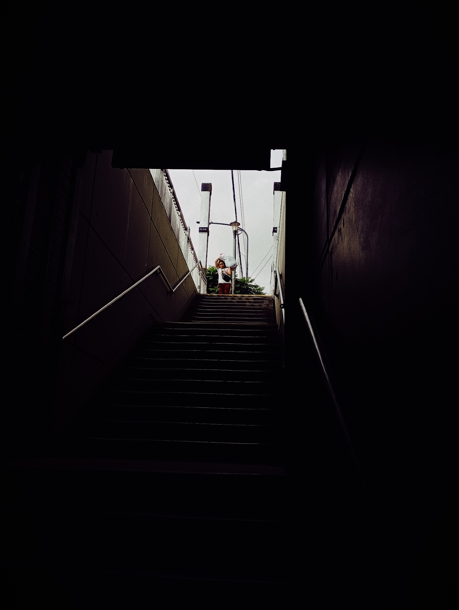 The image portrays a dramatic architectural scene, capturing a solitary figure ascending a dark, enclosed stairwell towards a brightly lit exit. The perspective is from within the shadowy depths of th…read more