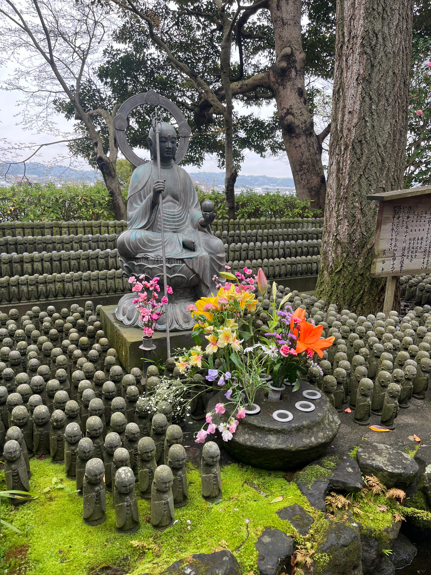 The image shows a stone statue of a seated figure with a halo behind its head, surrounded by numerous small stone statues, likely Jizo statues, in a garden setting. Fresh flowers are arranged around t…read more