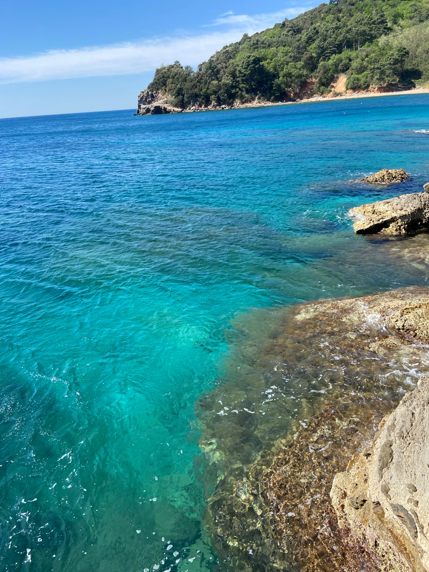 This image presents a serene coastal landscape in Budva, Montenegro, captured on a clear, sunny day. The scene is dominated by the vibrant turquoise and blue hues of the sea, which stretches across th…read more