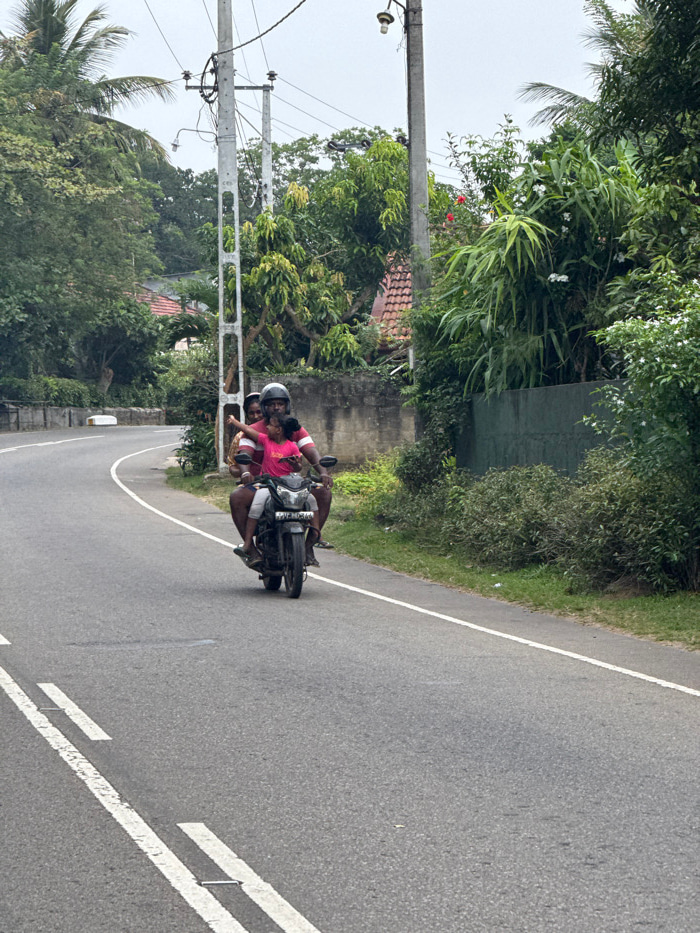 On a winding asphalt road, a family of three rides a motorbike. The driver, wearing a red and white shirt, navigates the turn. A child in a pink shirt sits in front, while another passenger is behind.…read more