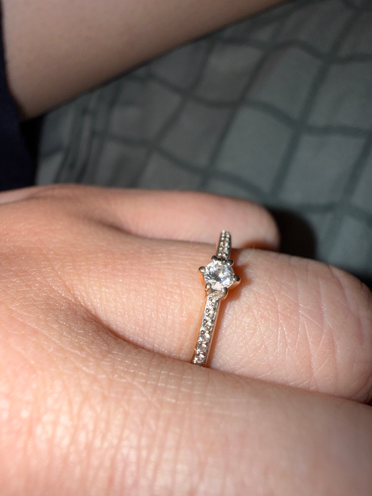 A close-up shot shows a hand wearing a diamond ring. The ring has a central larger diamond and smaller diamonds set along the band. The hand is slightly fleshy and the skin tone is fair. The background is out of focus, with a pattern of squares, potentially a blanket or bedding. No location information related to Donetsk, Ukraine is discernible from the image. | Open Wire
