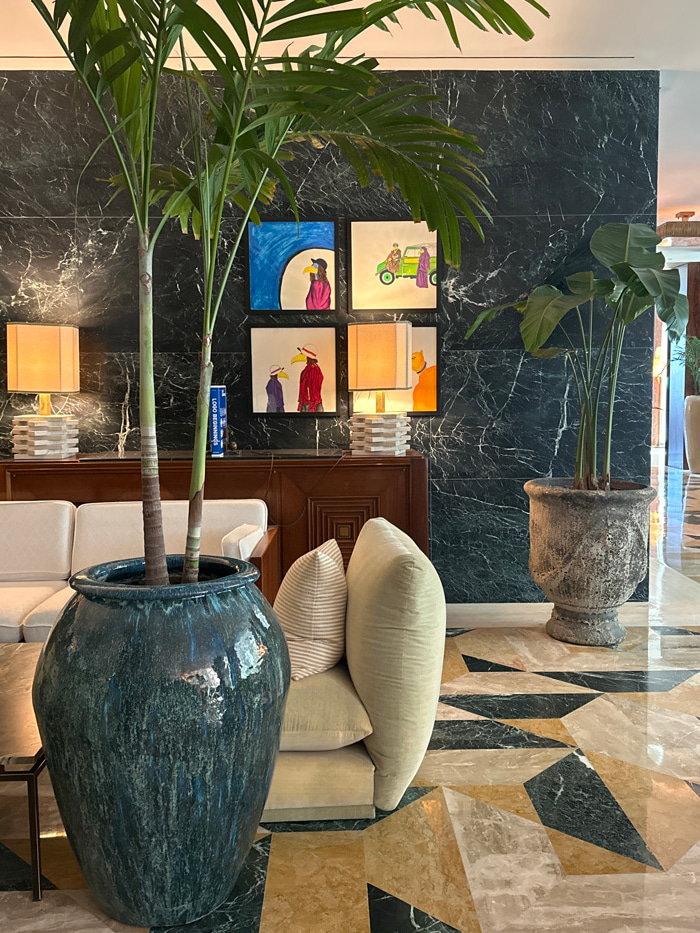 This image depicts a section of an interior space, identified as the lobby or lounge area of the Mandarin Oriental, Doha, Qatar. The scene features a dark green/black marble wall with white veining,…read more