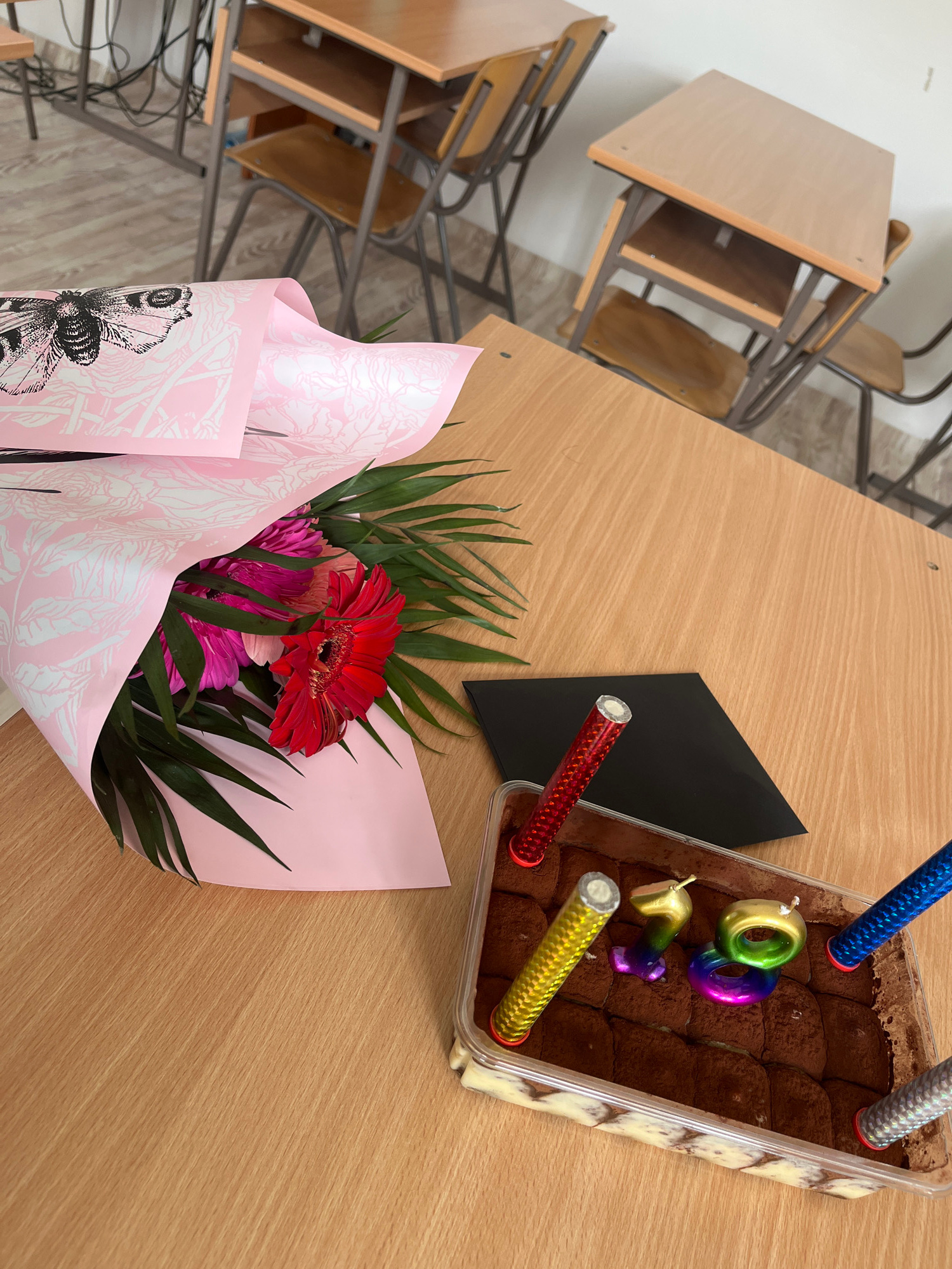 The image shows a desk in what appears to be a classroom setting. Several school desks are visible in the background, with an empty chair pushed under the closest one. On the desk in the foreground, t…read more