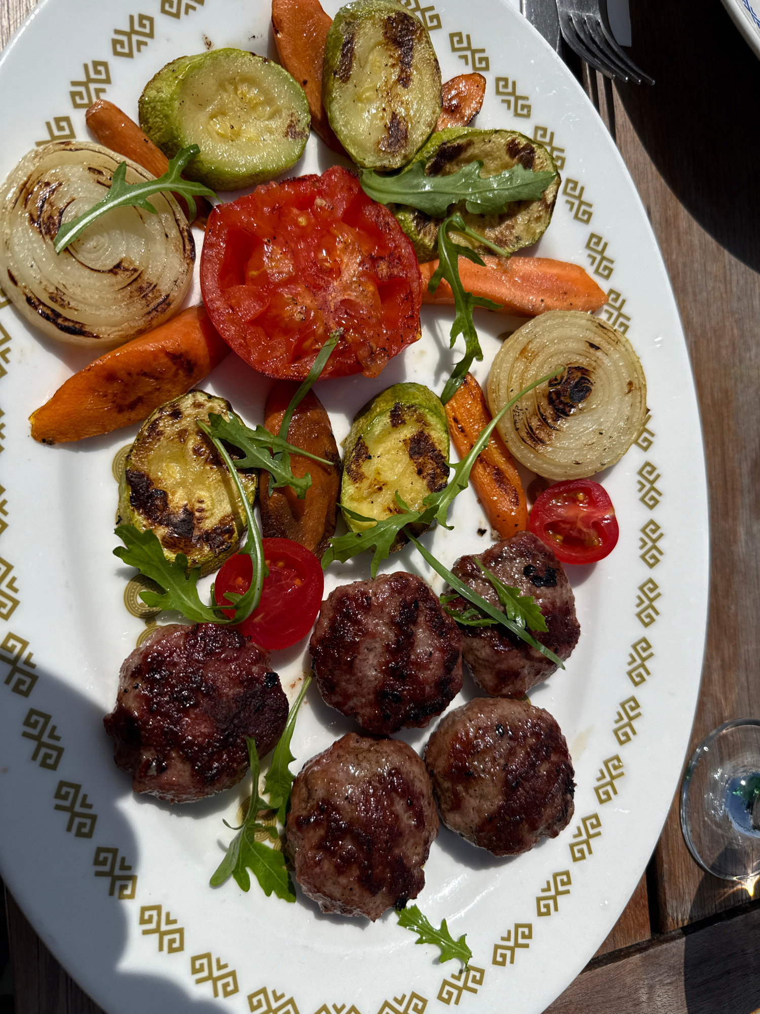A plate of food sits on a wooden surface. The plate contains grilled vegetables and meat. The vegetables include zucchini, tomato slices, carrot sticks, and onions. The meat appears to be small, round…read more