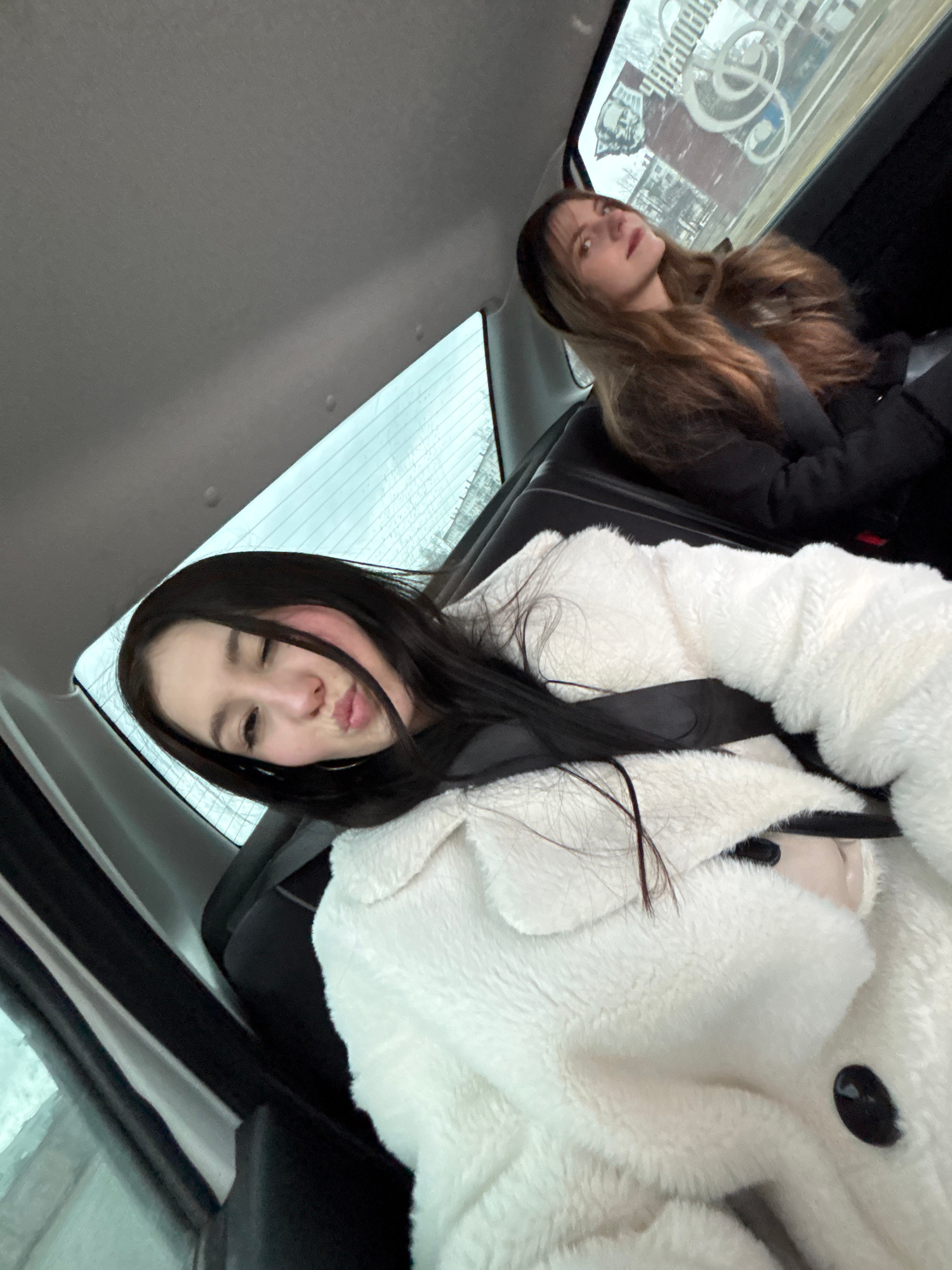 Two young women are inside a car. One woman is wearing a white, fluffy jacket and the other is wearing a dark coat. Both women are wearing seatbelts. The car appears to be parked and it looks to be a…read more