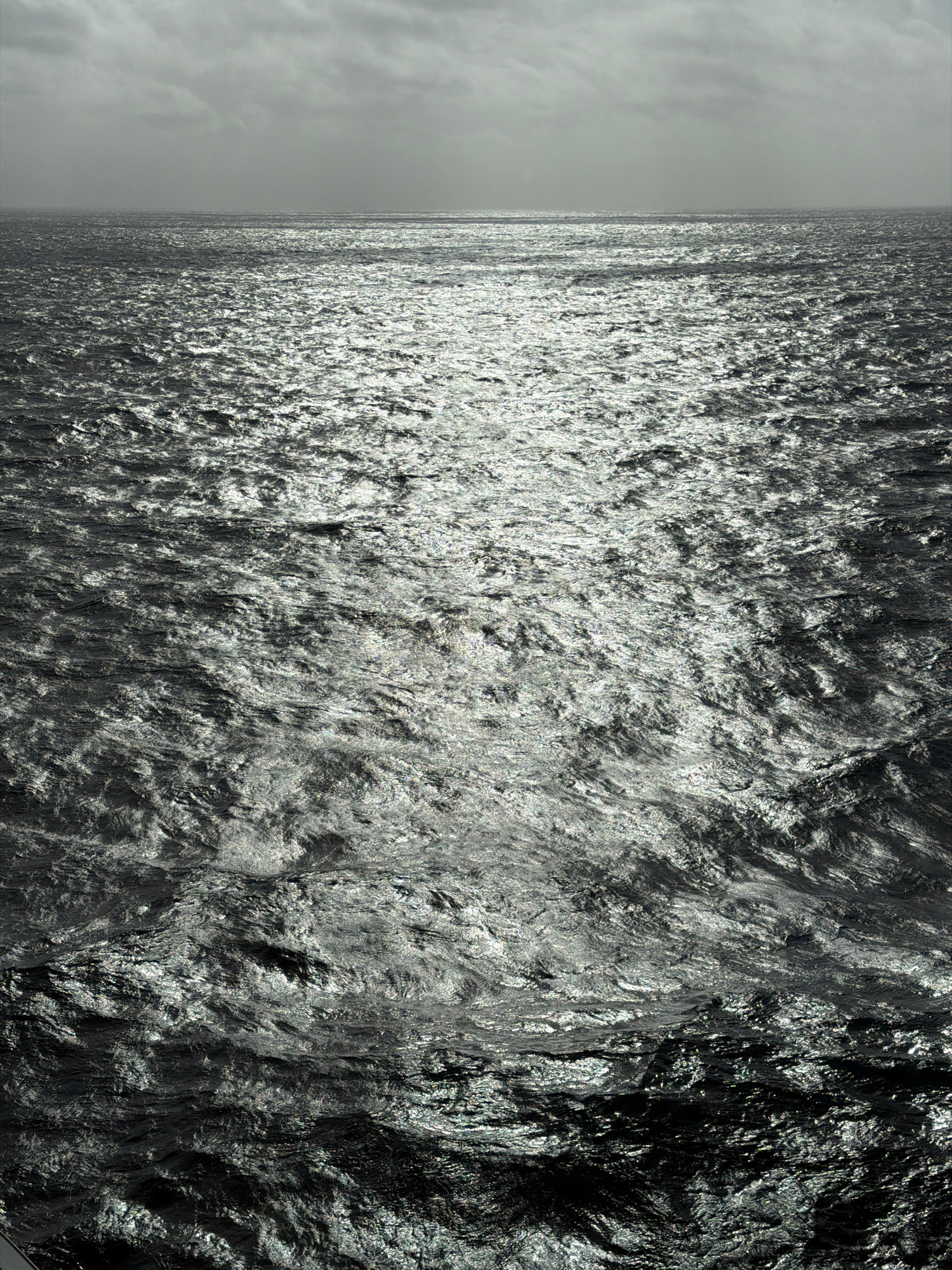 The image shows a body of water, possibly an ocean or large lake, under an overcast sky. The water surface is rough and textured, with areas of light reflection and dark shadows, suggesting wind-drive…read more