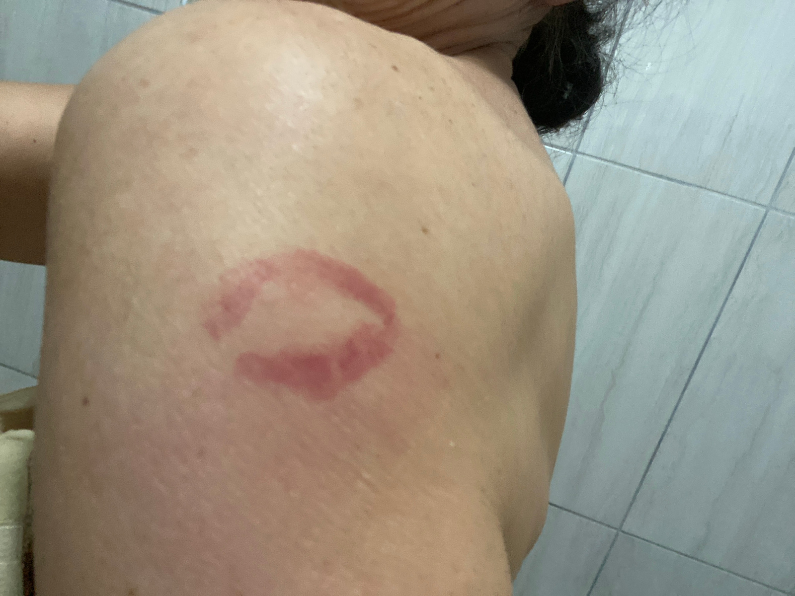 The image shows a person's shoulder with a red mark shaped like a kiss. The shoulder is light-skinned and has some freckles. The background is a tiled floor. There is no information in the image to in…read more