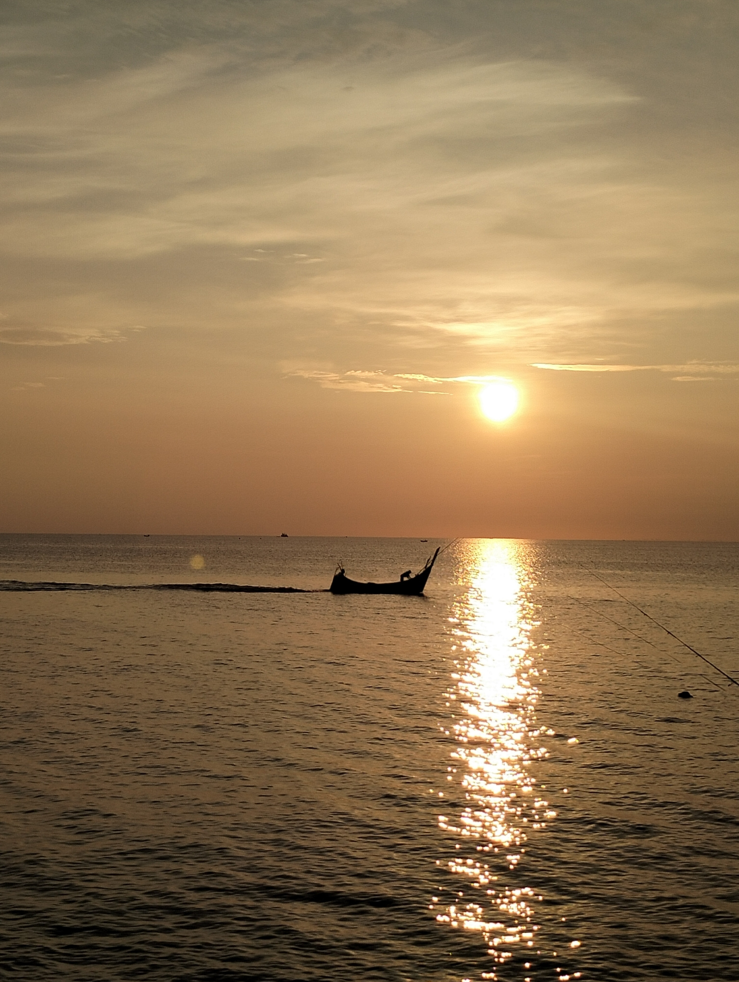 The image captures a sunset scene in Lhokseumawe, Indonesia. The sun is positioned in the upper-center, with its light reflecting off the water's surface as a bright, shimmering path. A small boat is…read more