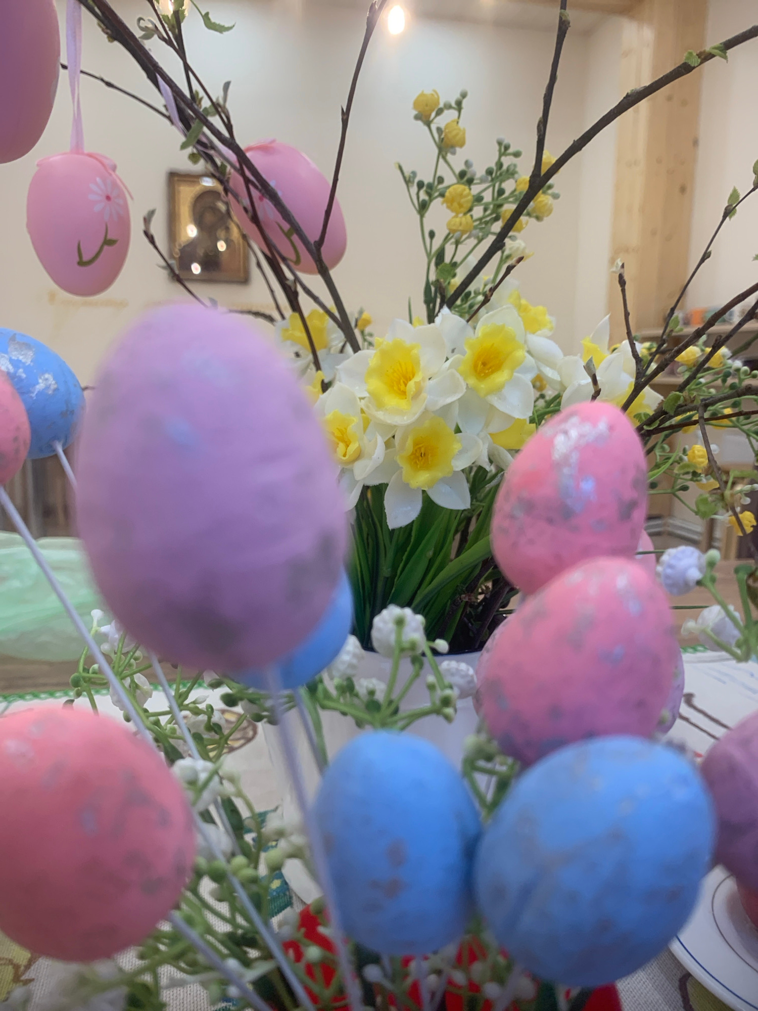 The image shows a close-up of an Easter decoration. There are pink and blue painted Easter eggs hanging from branches, intermingled with yellow and white daffodils and small white flowers. The backgroβ¦read more