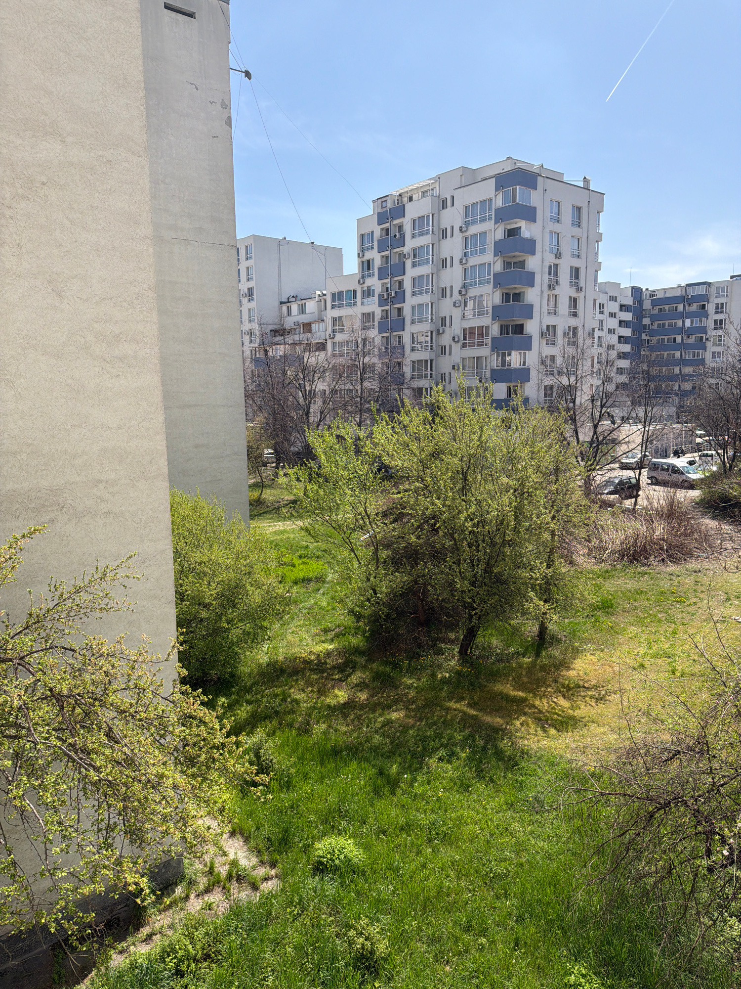 The image captures an urban scene in Sofia, Bulgaria, characterized by a mix of residential architecture and vibrant green spaces under a clear sky. The overall impression is one of a sunny spring day…read more