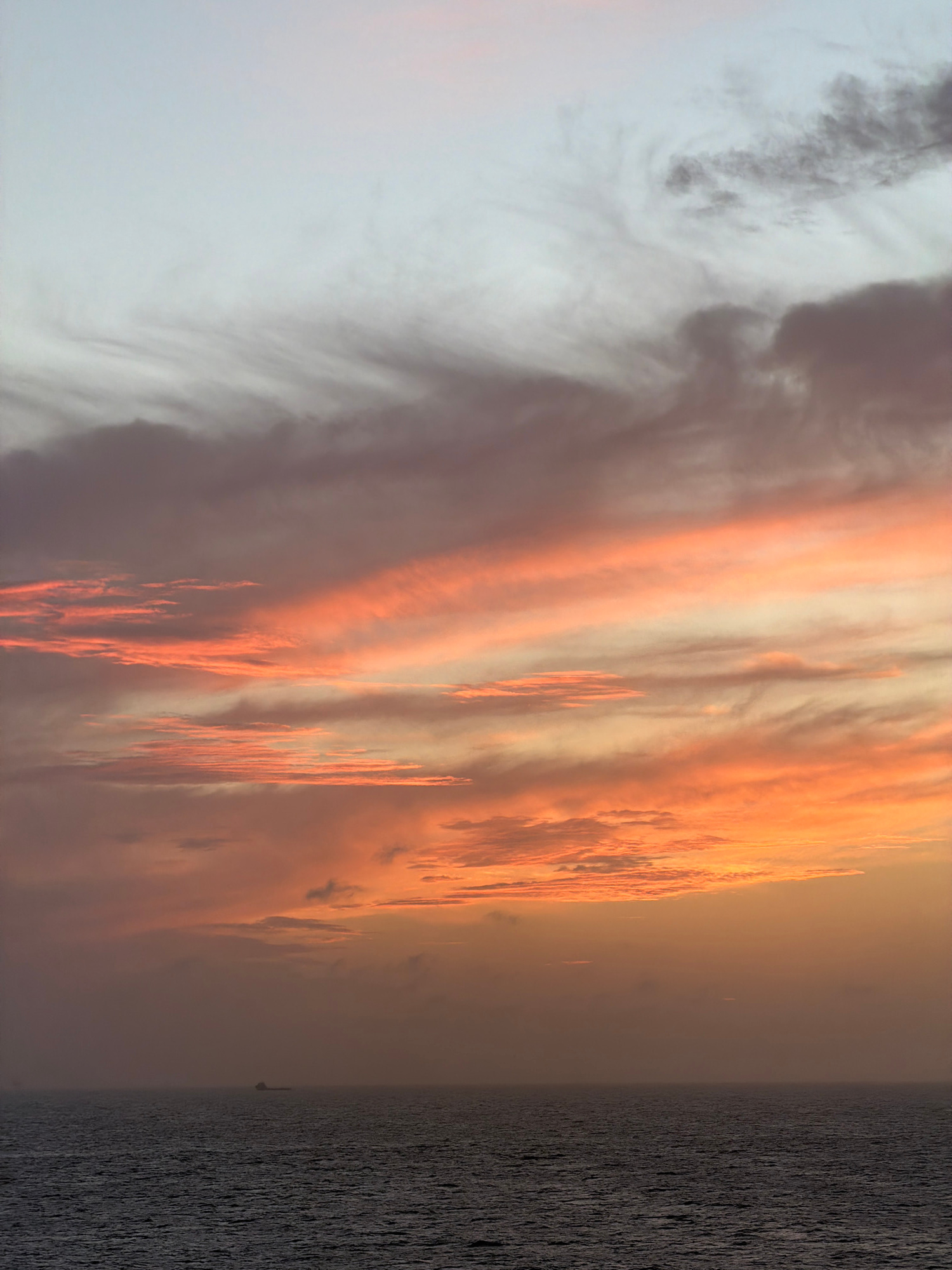 The image shows a sunset over the ocean. The sky is filled with clouds, which are illuminated in shades of orange and pink. The ocean is dark and choppy. A sailboat is visible on the horizon. The loca…read more