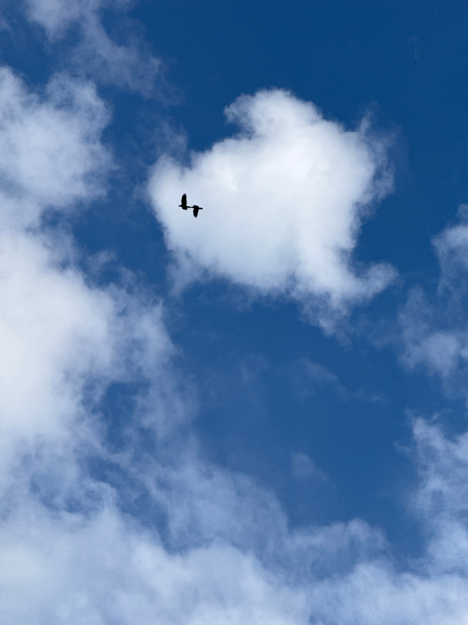A bright blue sky is interspersed with white clouds, some fluffy and isolated, others more dispersed and wispy. Two dark silhouettes of birds are visible against a prominent white cloud in the upper-l…read more