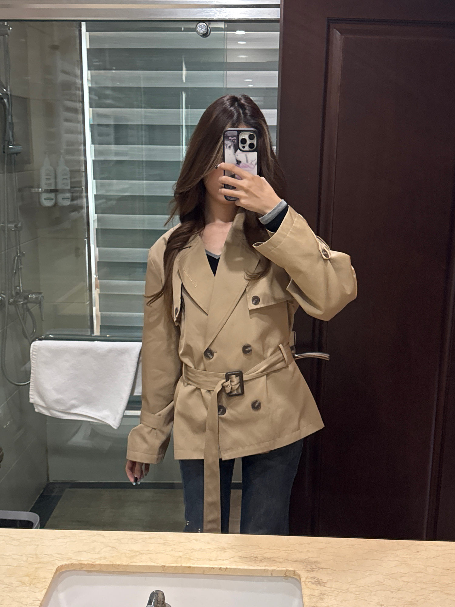 A person is holding a smartphone to take a selfie in front of a mirror in a bathroom. The person is wearing a light brown trench coat over a dark-colored top. The bathroom features a shower area with…read more