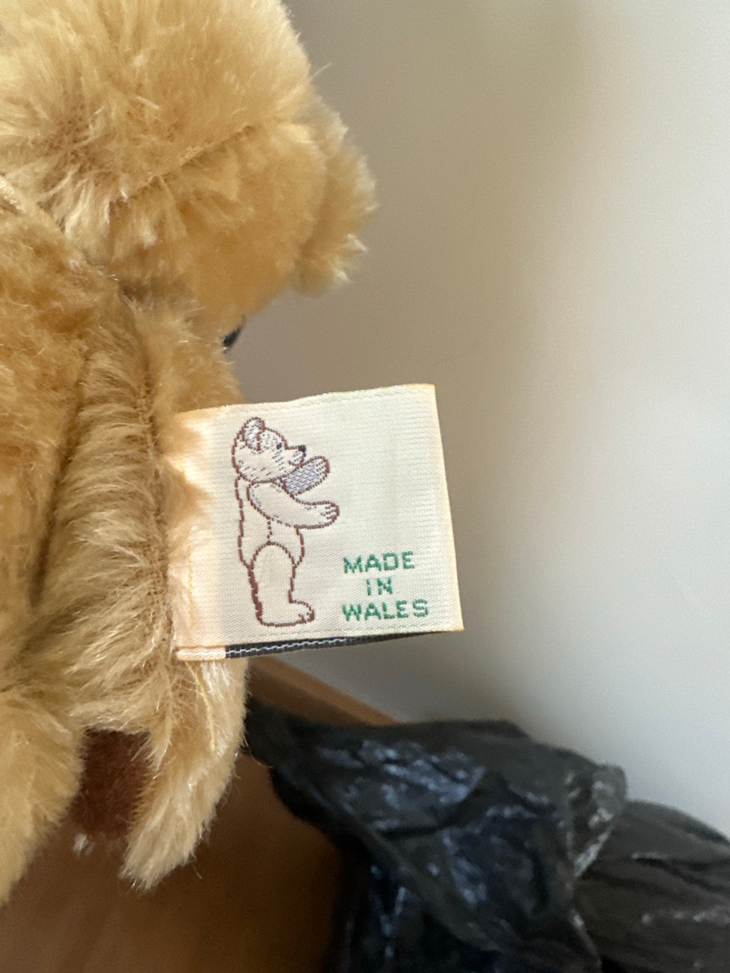 The image displays a close-up, angled view of a light brown, fluffy teddy bear, specifically its upper torso and shoulder. A cream-colored fabric tag is sewn into the bear's left side. The tag featureβ¦read more