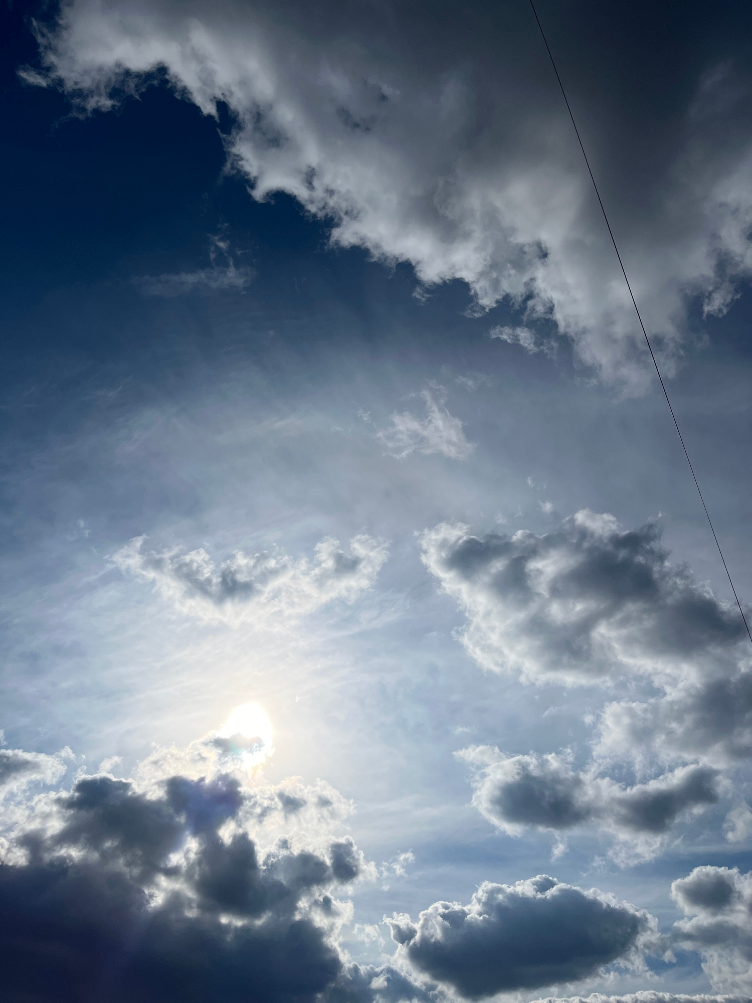 The image shows a daytime sky with scattered cumulus clouds. The sun is partially obscured by clouds in the lower right, creating a bright area. A dark blue portion of the sky is visible in the lower…read more