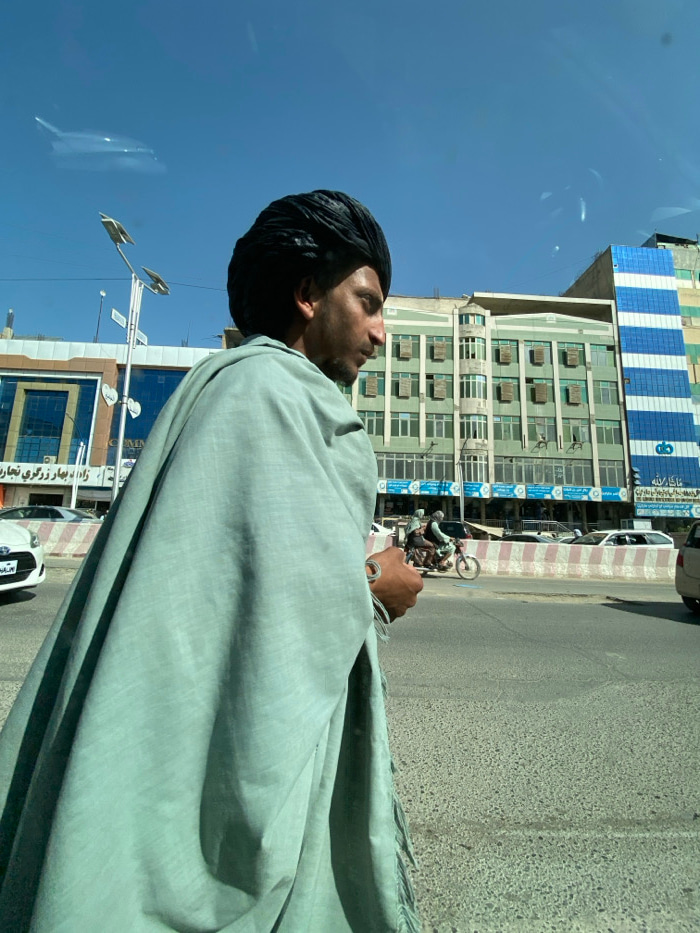 The image depicts a street scene in Kandahar, Afghanistan, on a clear, sunny day. In the foreground, viewed from the right side, is a man wearing a dark, coiled turban and a light teal-green shawl dra…read more