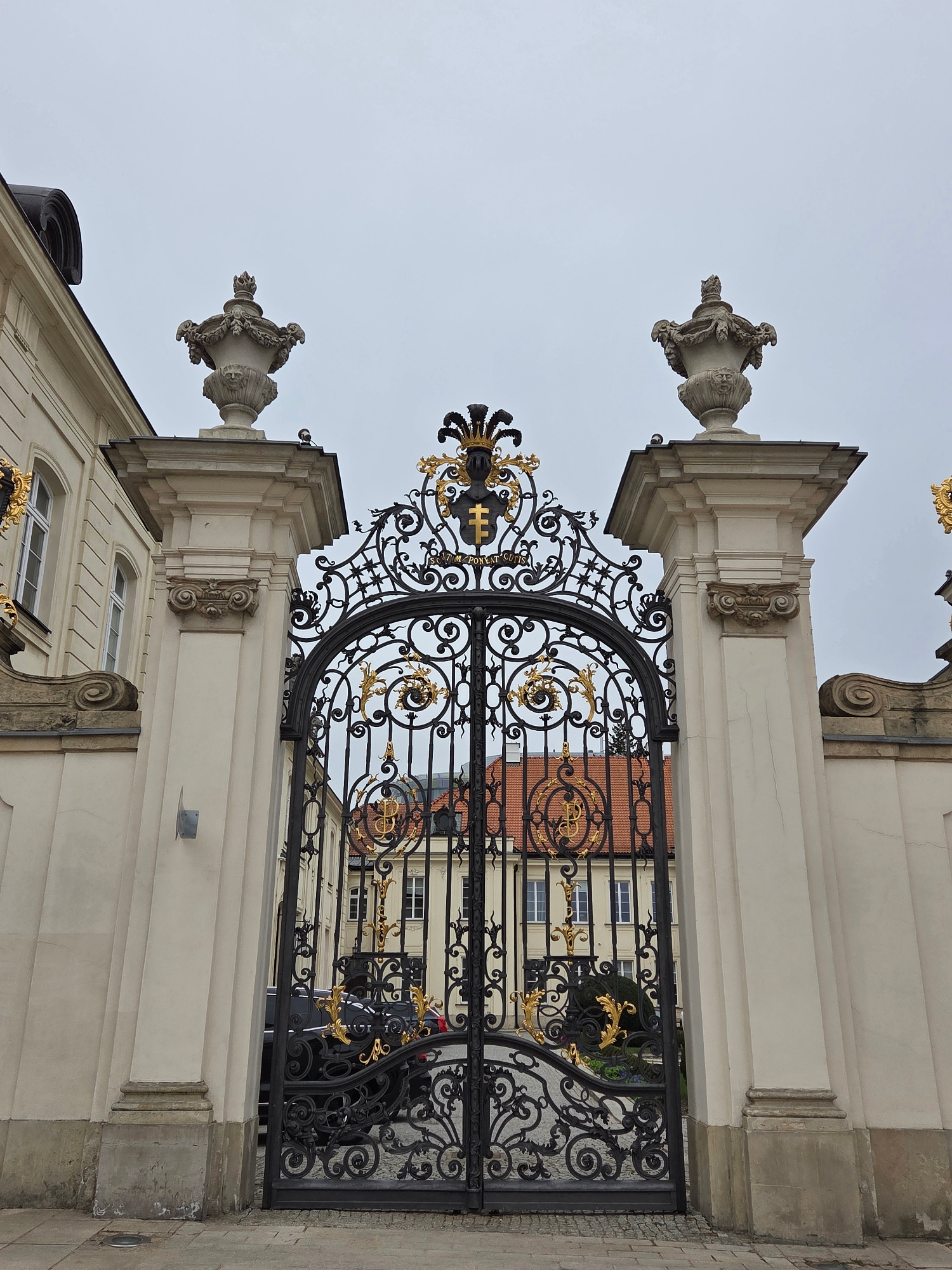 The image depicts a wrought iron gate in Warsaw, Poland. The gate is predominantly black, adorned with gold embellishments. It stands between two white, classically styled pillars topped with decorati…read more