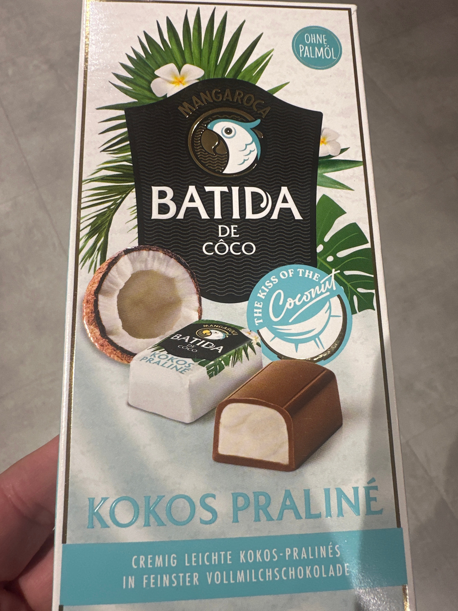 The image shows a package of Mangaroca Batida de Côco Kokos Praliné. The packaging is white with gold trim and features a tropical design with palm leaves and a white flower. The Mangaroca Batida logo…read more